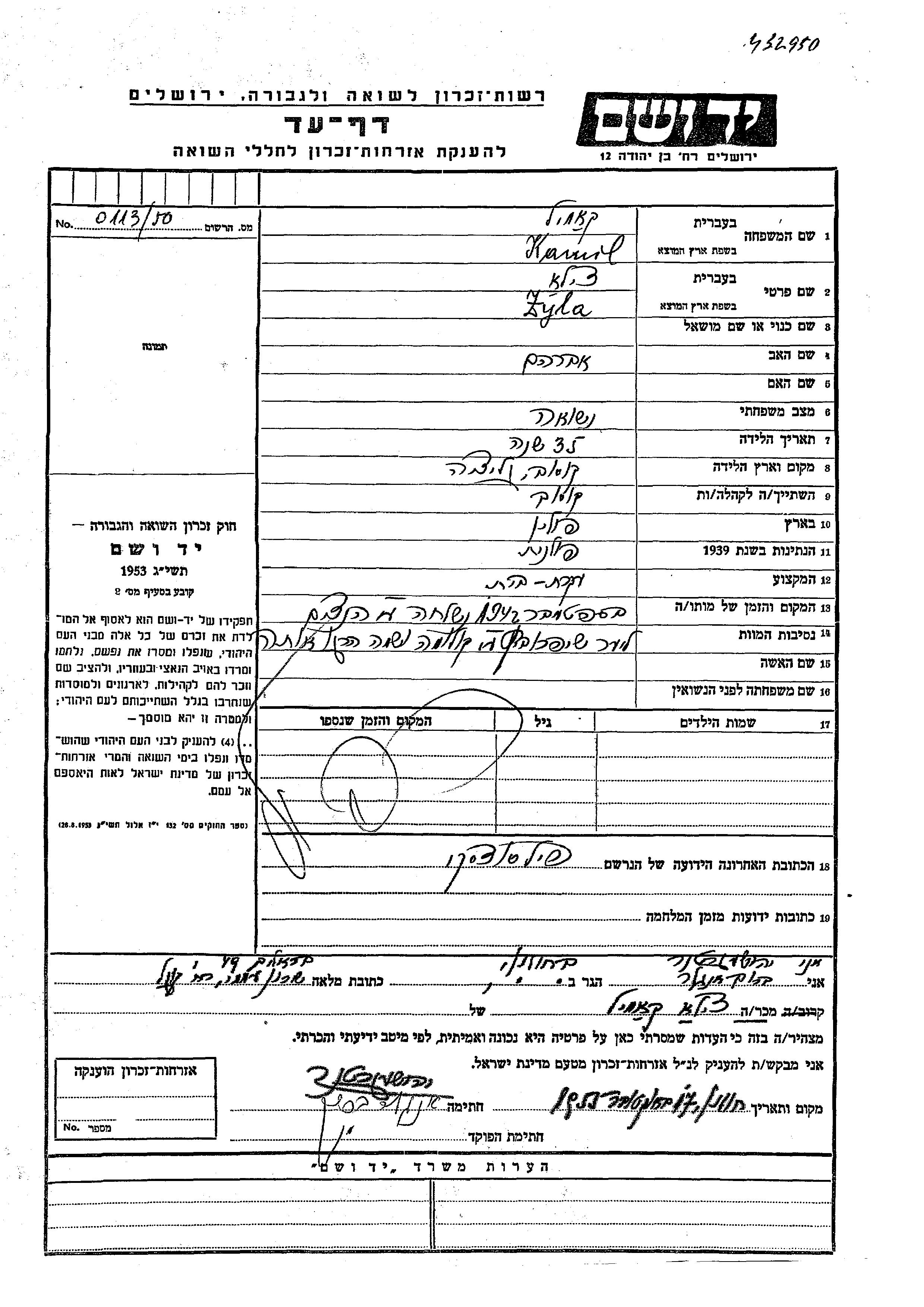 Zyla קאמיל נולדה בKosow שבפולין לאברהם. היא היתה עקרת בית ונשואה. לפני מלחמת העולם השניה התגוררה בKosow שבפולין.