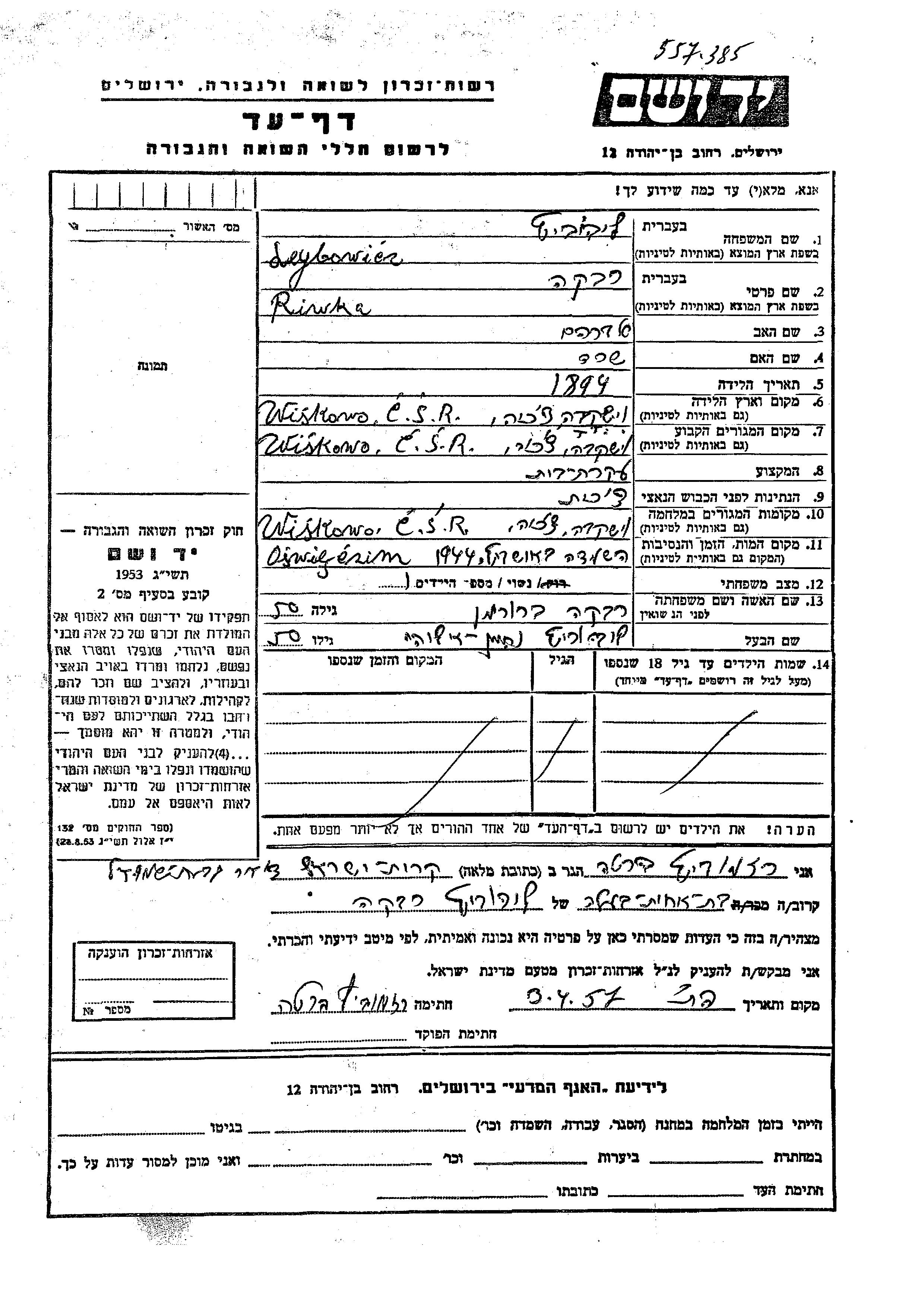 Leybowicz Riwka 1894 Wiskow, פולין דף-עד