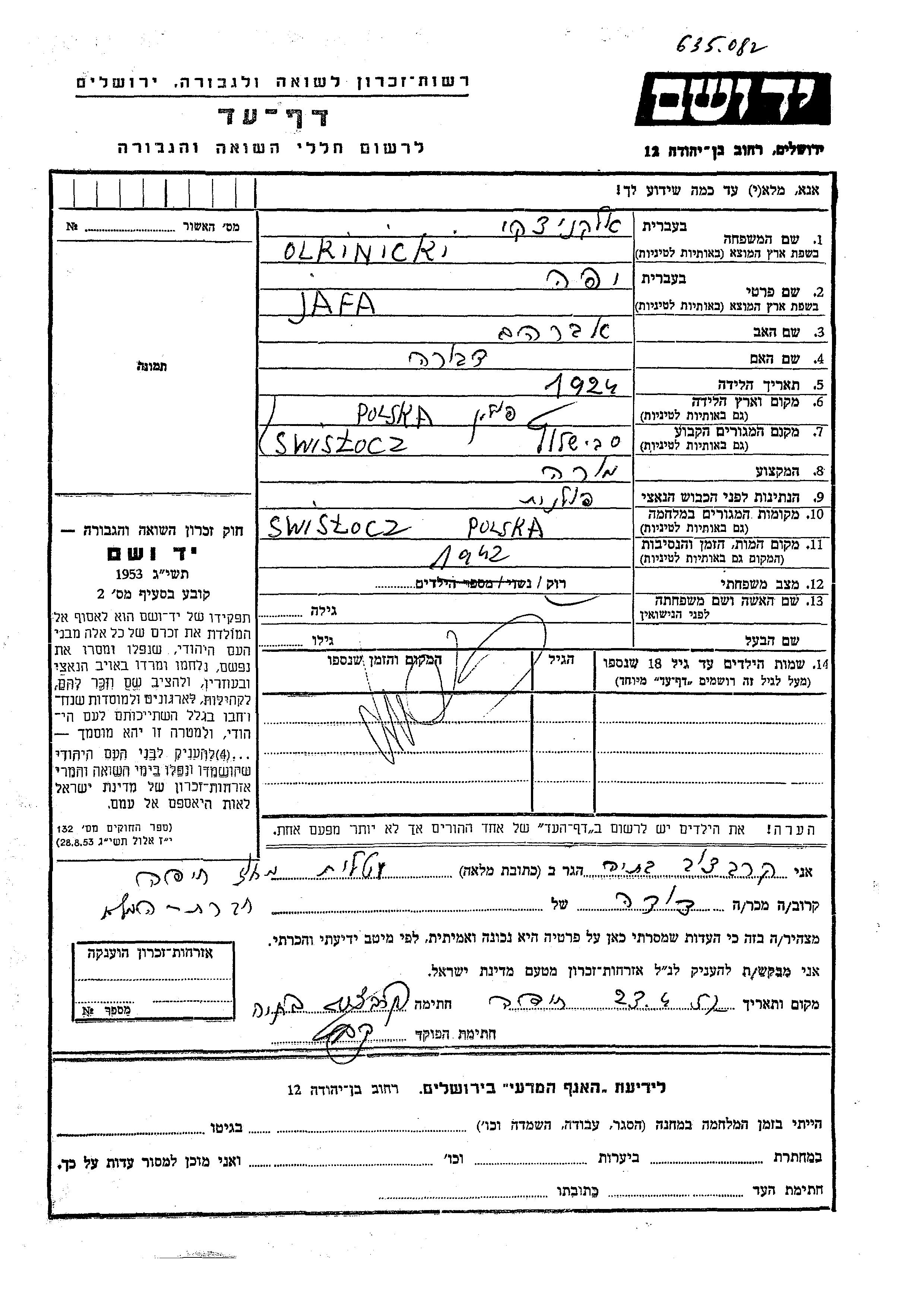 Jafa Olkinicki נולדה בSwislocz שבפולין בשנת 1924 לאברהם ודבורה. היא היתה מורה ורווקה. לפני מלחמת העולם השניה התגוררה בSwislocz שבפולין. בזמן המלחמה היא היתה בSwislocz שבפולין.