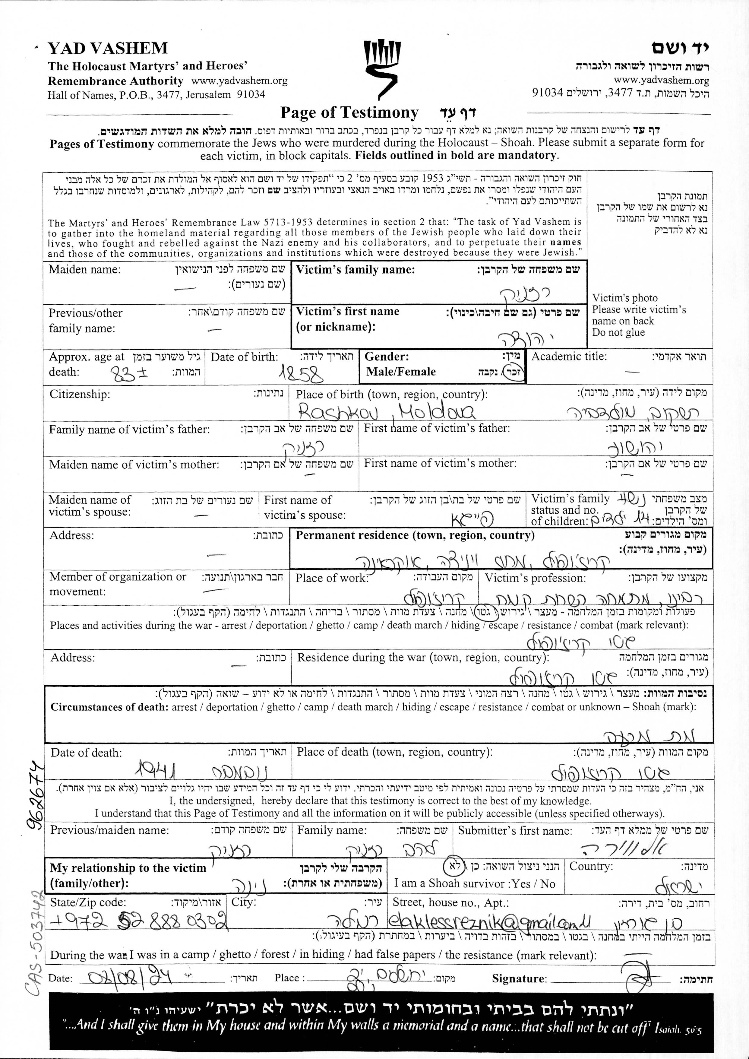 יהודה נרצח בשואה. מקום המוות: Kryzhopol שבאוקראינה (ברה"מ) בשנת 11/1941.