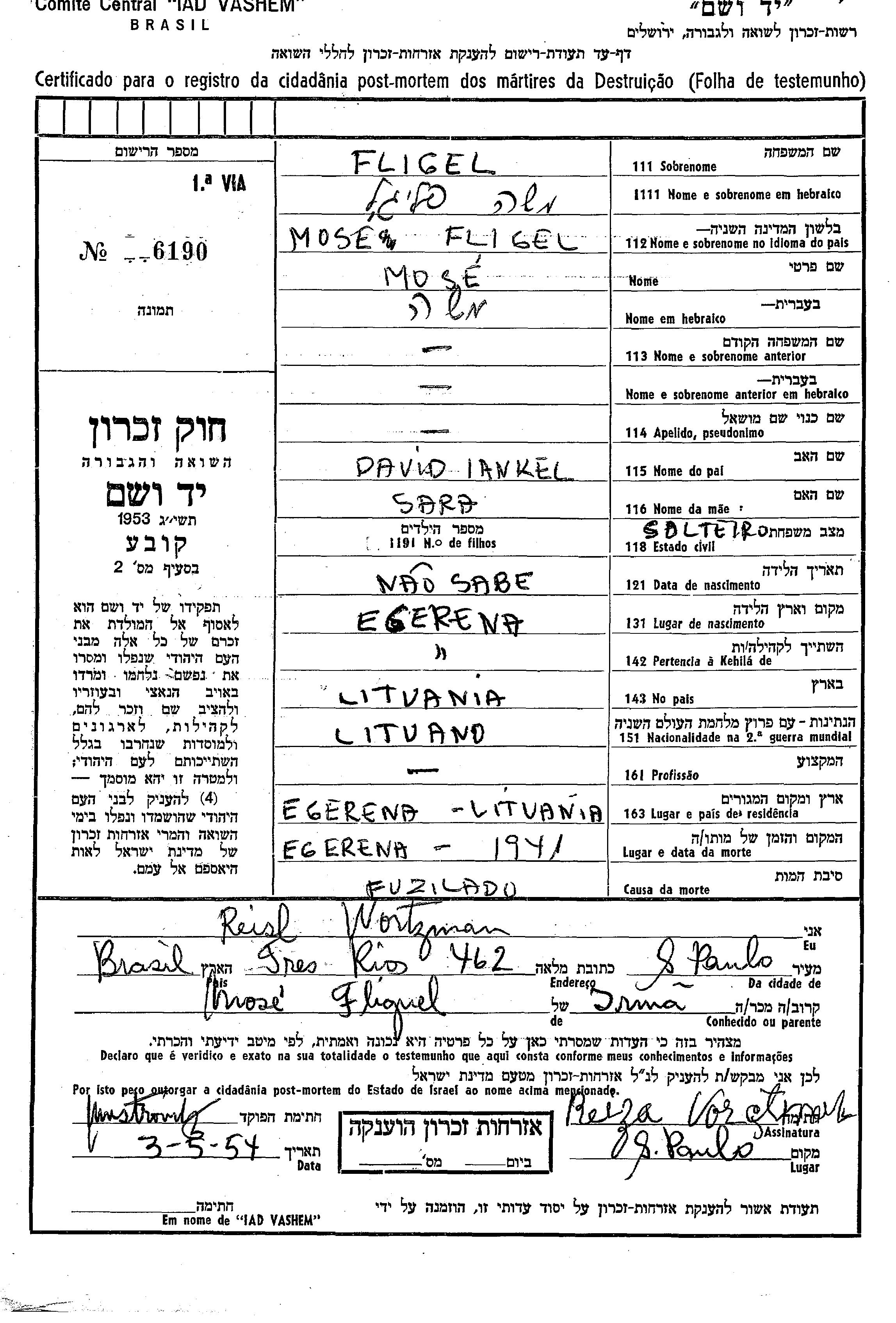 Mose פליגל נולד בEzereni שבלטביה לינקל דוד ושרה. הוא היה רווק. לפני מלחמת העולם השניה התגורר בEzereni שבלטביה. בזמן המלחמה הוא היה בEzereni שבלטביה.