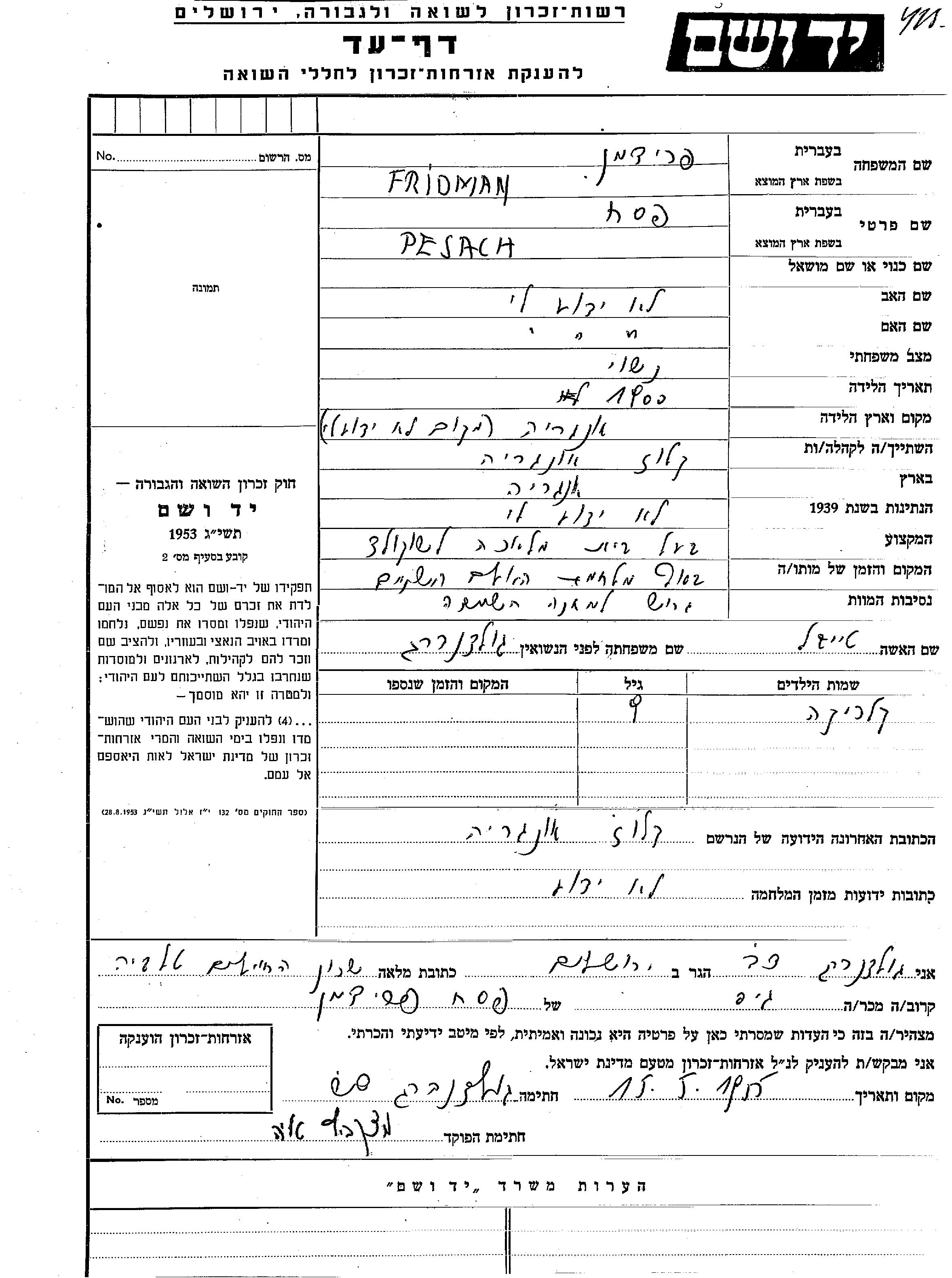 Pesach פרידמן נולד בהונגריה שבהונגריה בשנת 1900. הוא היה בעל בית מלאכה לשוקולד ונשוי לטייבל לבית גולדנברג. לפני מלחמת העולם השניה התגורר בCluj שברומניה. בזמן המלחמה הוא היה בCluj שברומניה. הוא נרצח בשואה.