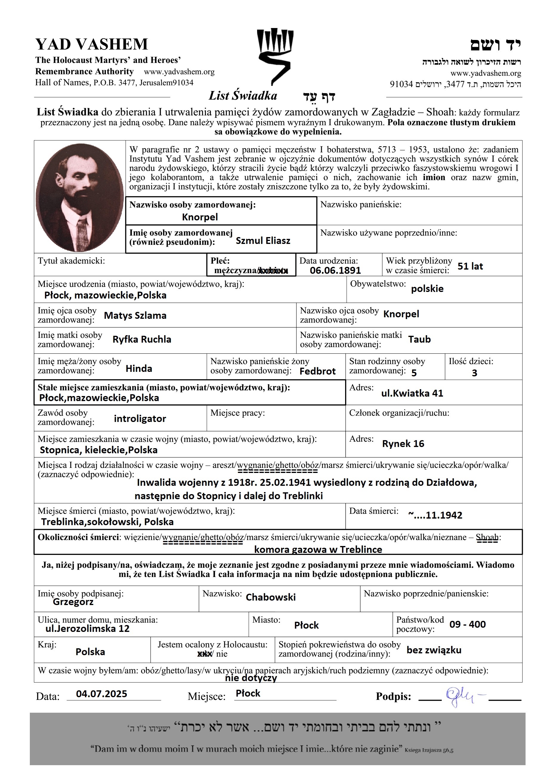 Szmul Eliasz Knorpel נולד בPlock שבפולין בשנת 1891. הוא היה Introligator. לפני מלחמת העולם השניה התגורר בPlock שבפולין.