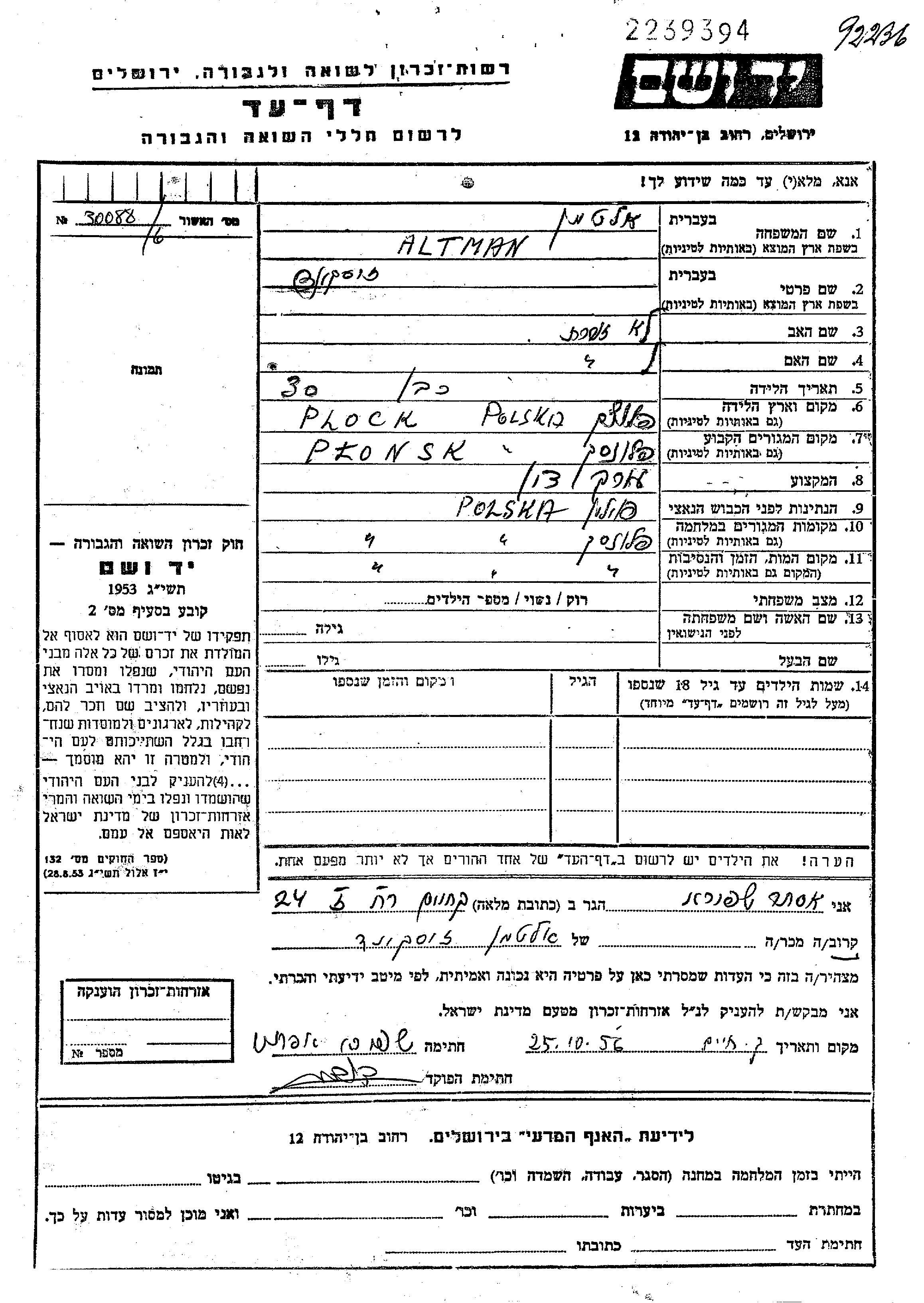 Zyskind Altman נולד בPlock שבפולין בשנת 1907. הוא היה עורך דין. לפני מלחמת העולם השניה התגורר בPlonsk שבפולין.