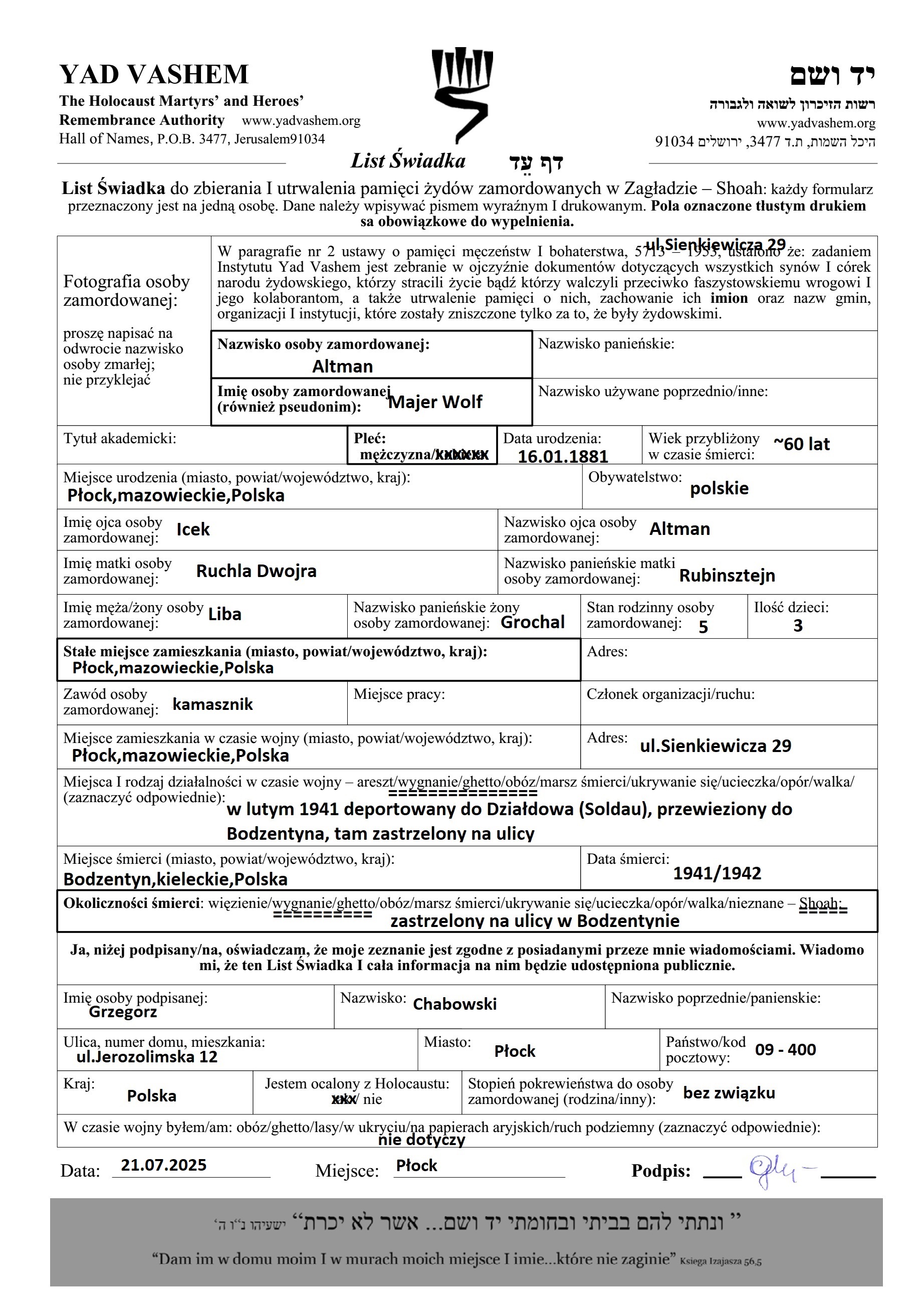 Majer Wolf Altman נולד בPlock שבפולין בשנת 1881. הוא היה גזרן נעליים. לפני מלחמת העולם השניה התגורר בPlock שבפולין.