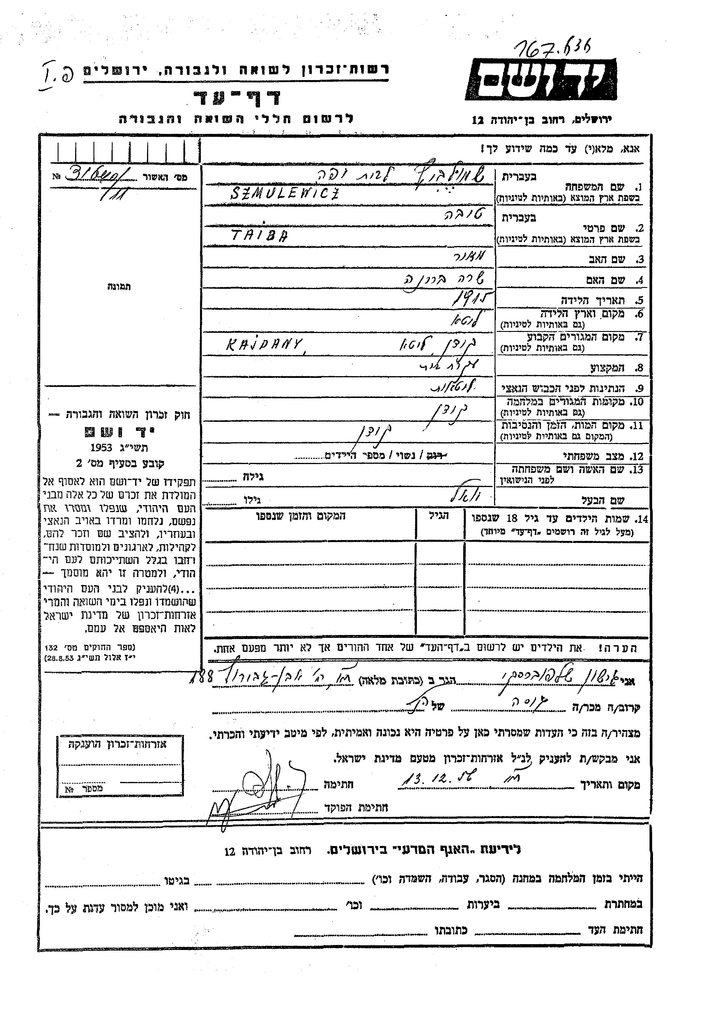 Taiba טובה Szmulewicz לבית יפה נולדה בליטא בשנת 1915 למאיר ושרה רינה. היא היתה עקרת בית ונשואה ליואל. לפני מלחמת העולם השניה התגוררה בKajdany שבליטא. בזמן המלחמה היא היתה בKajdany שבליטא.