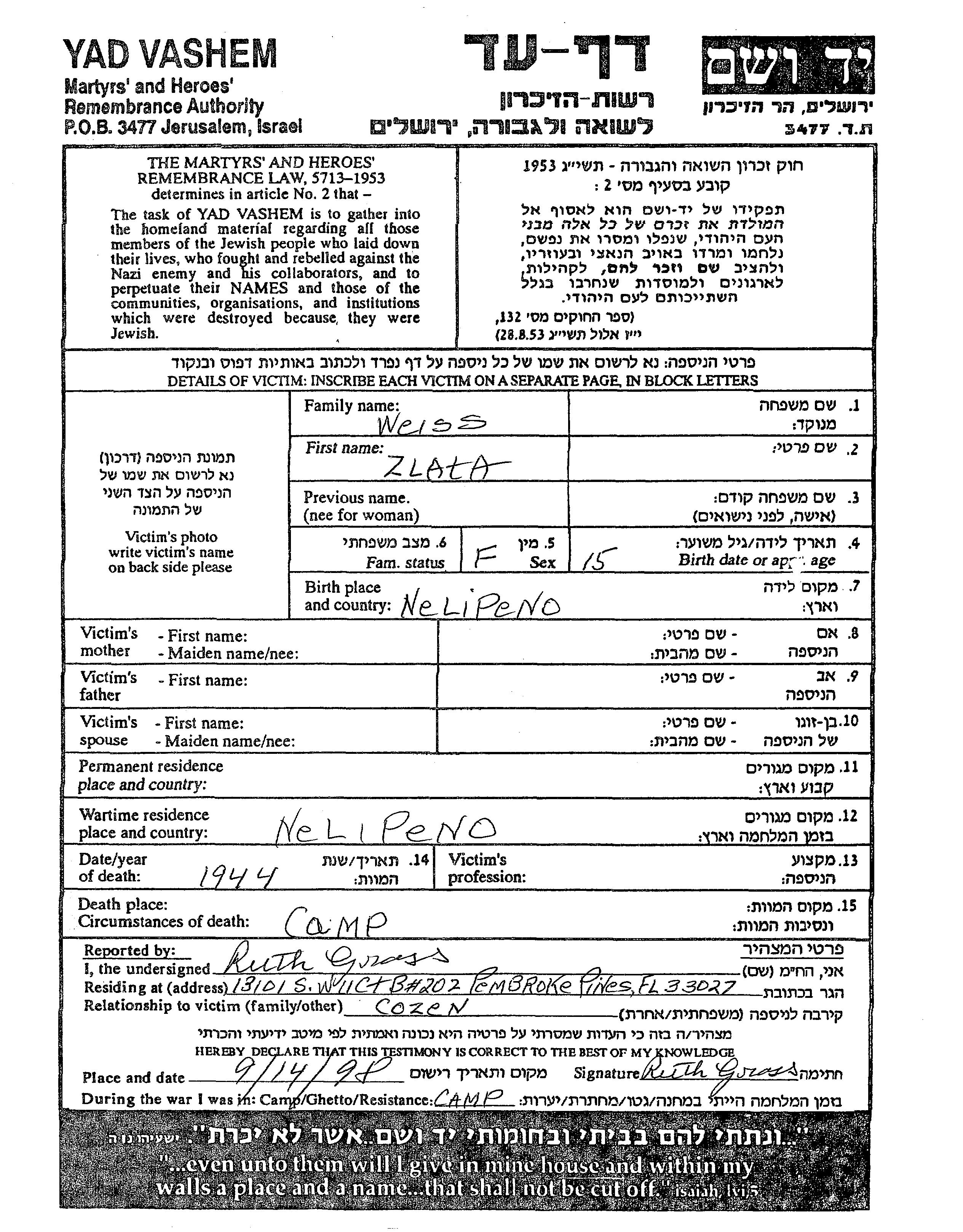 זלטה Weiss נולדה בNelipeno שבצ'כוסלובקיה. בזמן המלחמה היא היתה בNelipeno שבצ'כוסלובקיה.