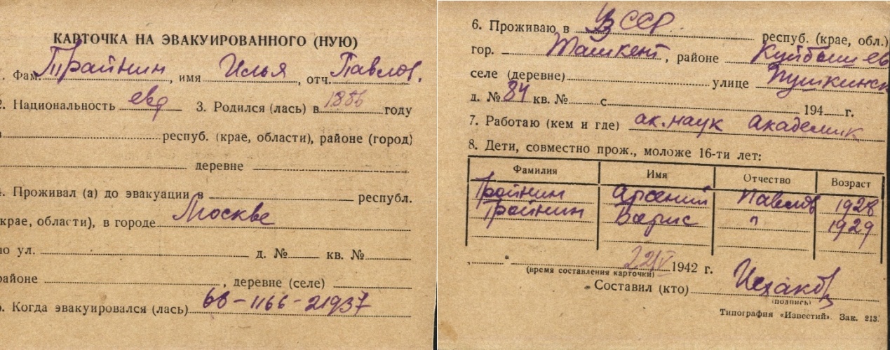 כרטסת של יהודים תושבי ברית המועצות שפונו ל- Tashkent ומשם למקומות שונים באוזבקיסטן , פברואר 1942