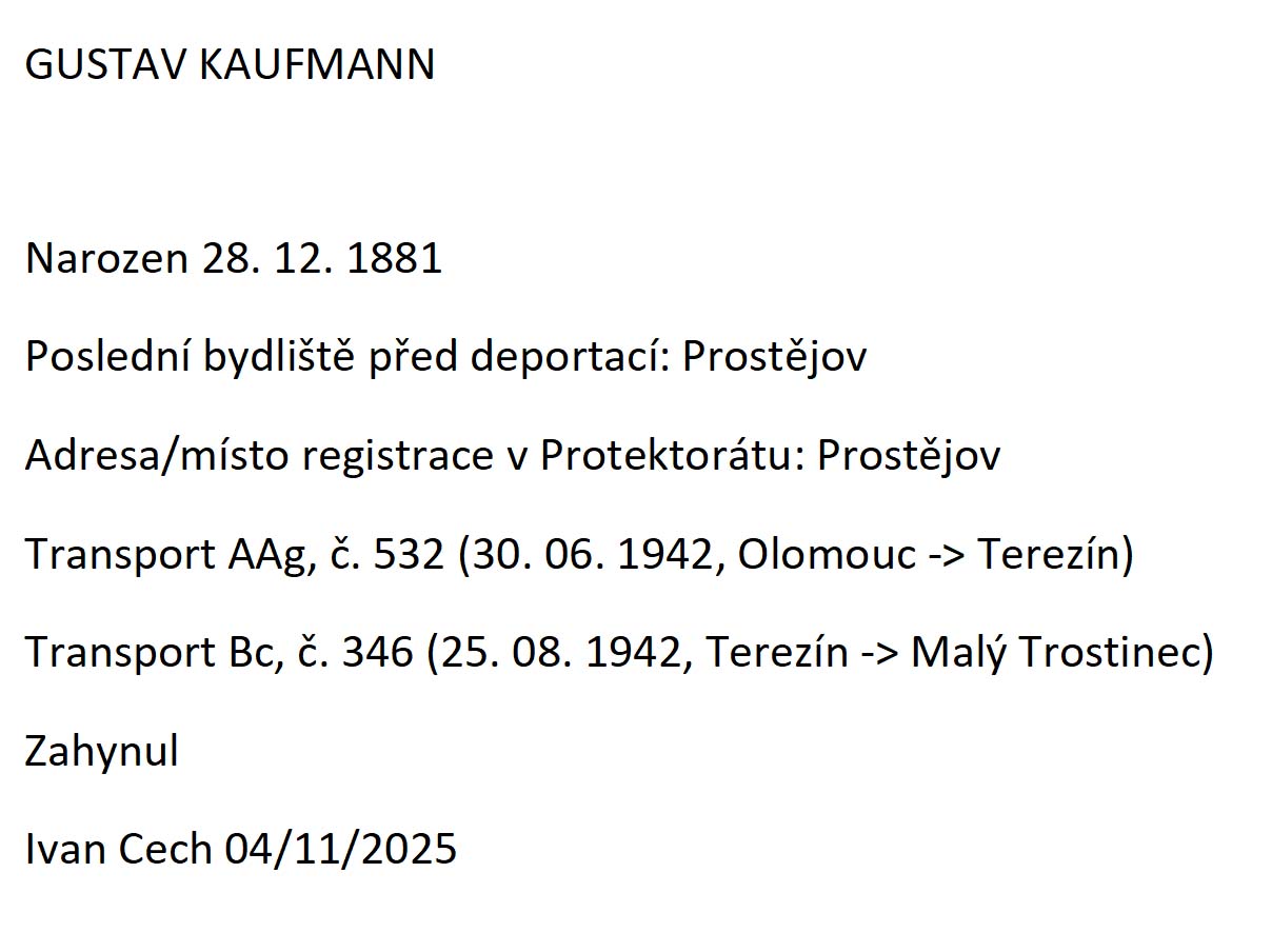| Kaufmann | גוסטב | 28/12/1881 | Prostejov, צ'כוסלובקיה | Photos |