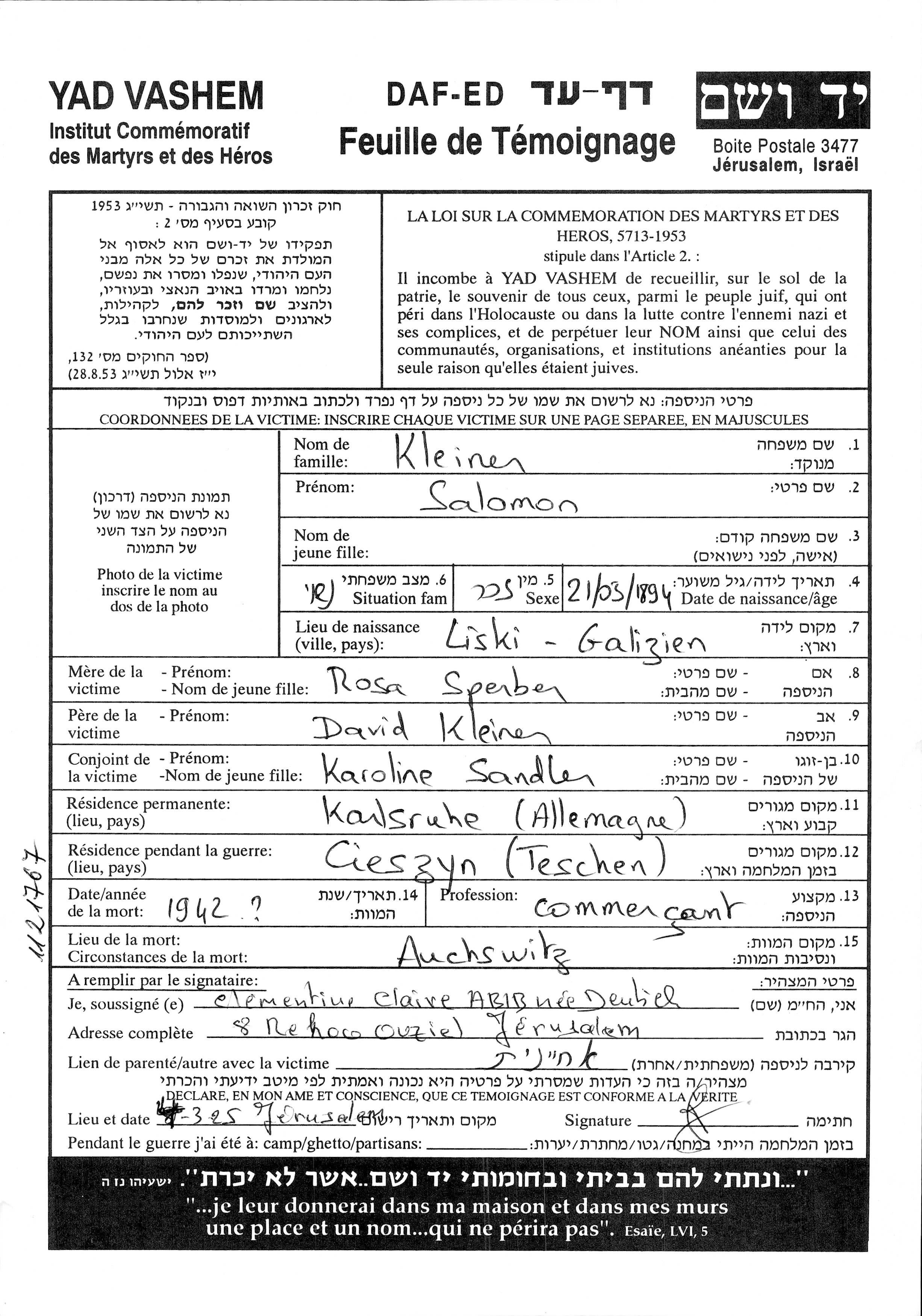 Salomon Kleiner נולד בLiski שבפולין בשנת 1894. הוא היה סוחר. לפני מלחמת העולם השניה התגורר בKarlsruhe שבגרמניה.