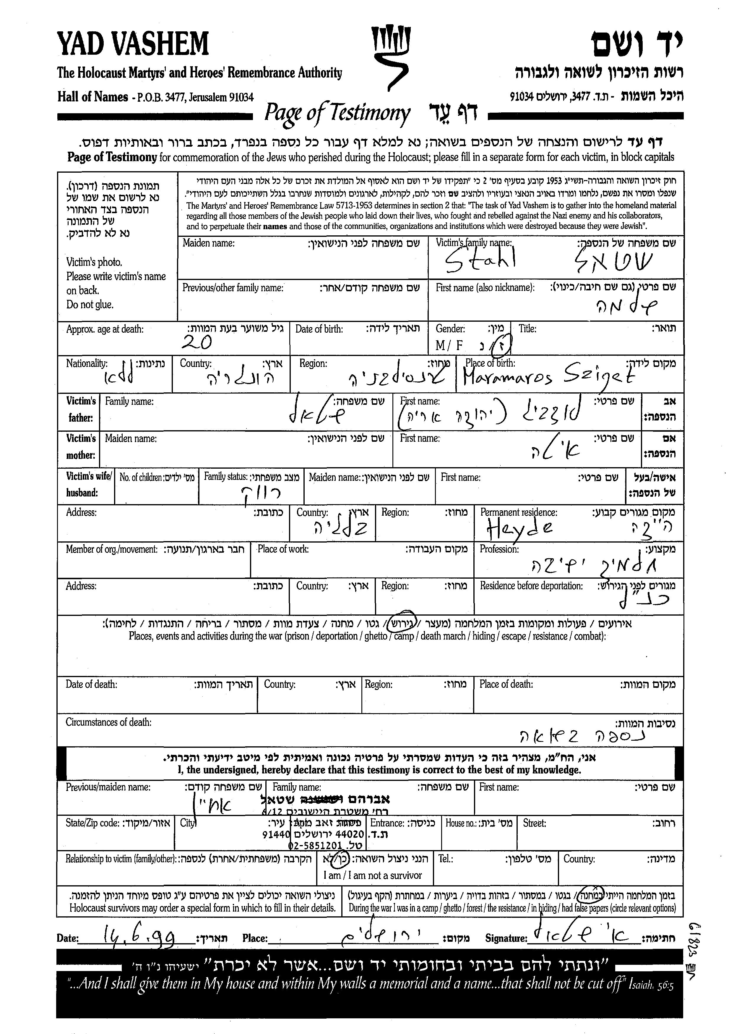 שלמה Stahl נולד בSziget שברומניה ללודביג יהודה ואיטה. הוא היה תלמיד ישיבה ורווק. לפני מלחמת העולם השניה התגורר בHeyde שבבלגיה. בזמן המלחמה הוא היה בHeyde שבבלגיה. שלמה נרצח בשואה.