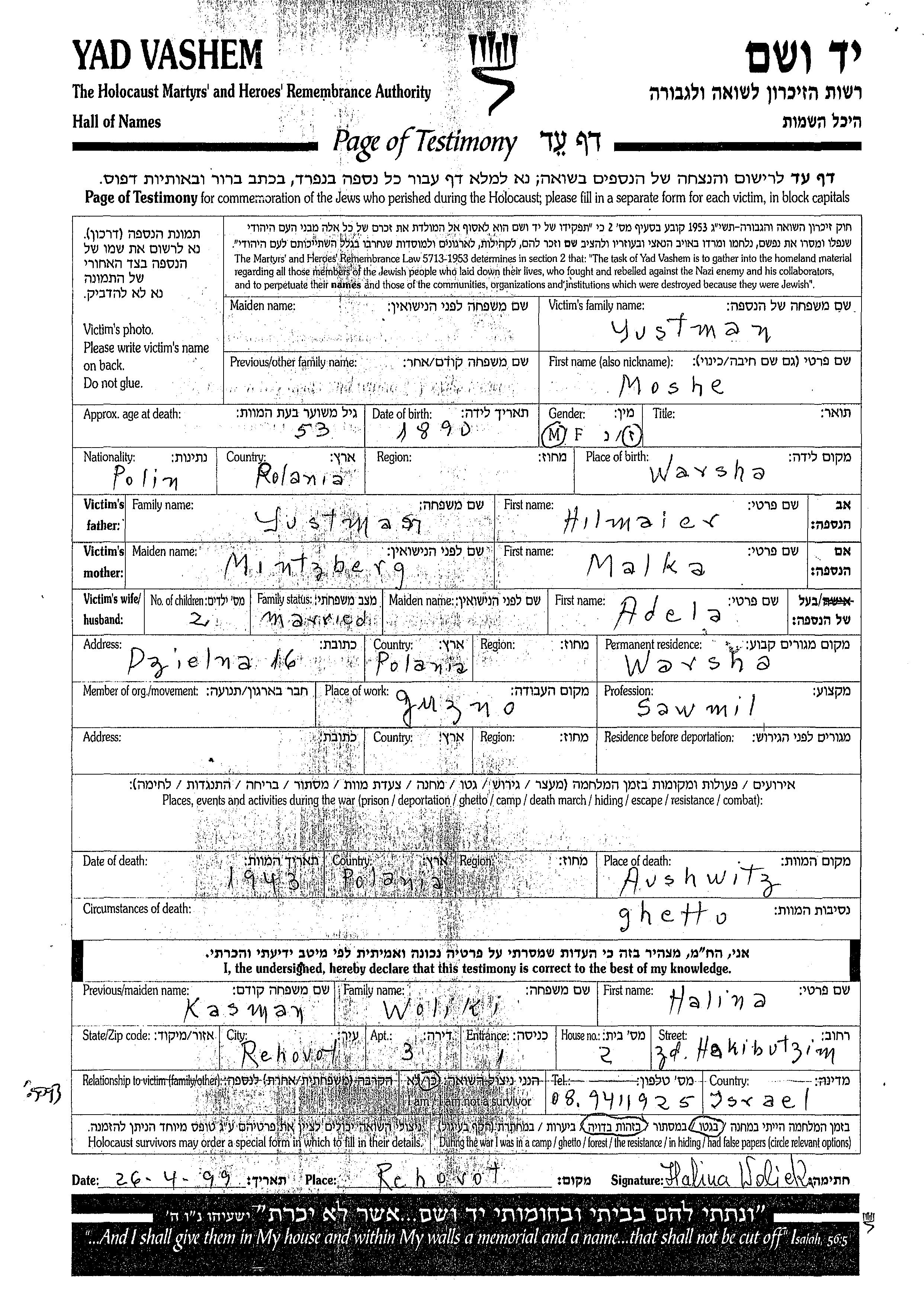 משה Justman נולד בWarsaw שבפולין בשנת 1890 לחילמיאר ומלכה. הוא היה Sawmill ונשוי לאדלה. לפני מלחמת העולם השניה התגורר בWarsaw שבפולין. בזמן המלחמה הוא היה בWarszawa שבפולין.
