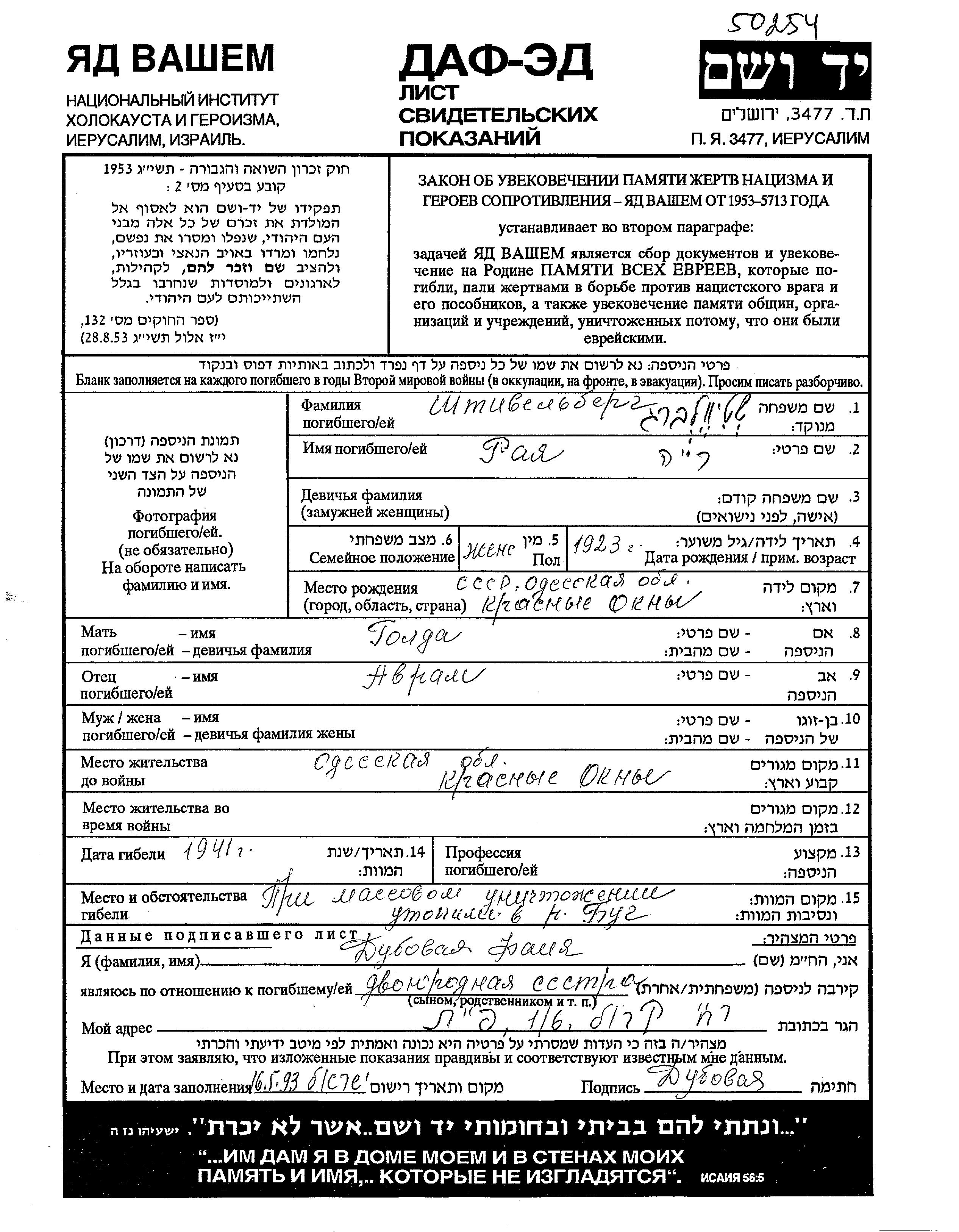 רייה נרצחה בשואה. מקום המוות: לא ידוע בשנת 1941.