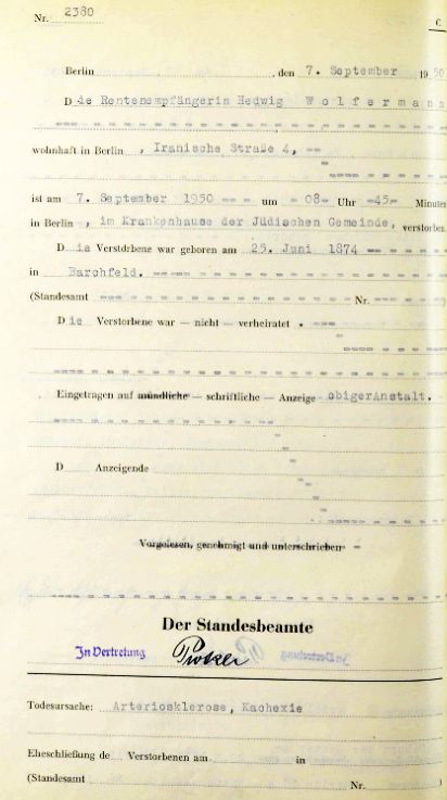 הדוויג Wolfermann נולדה בBarchfeld שבגרמניה בשנת 1874. לפני מלחמת העולם השניה התגוררה בBarchfeld שבגרמניה.