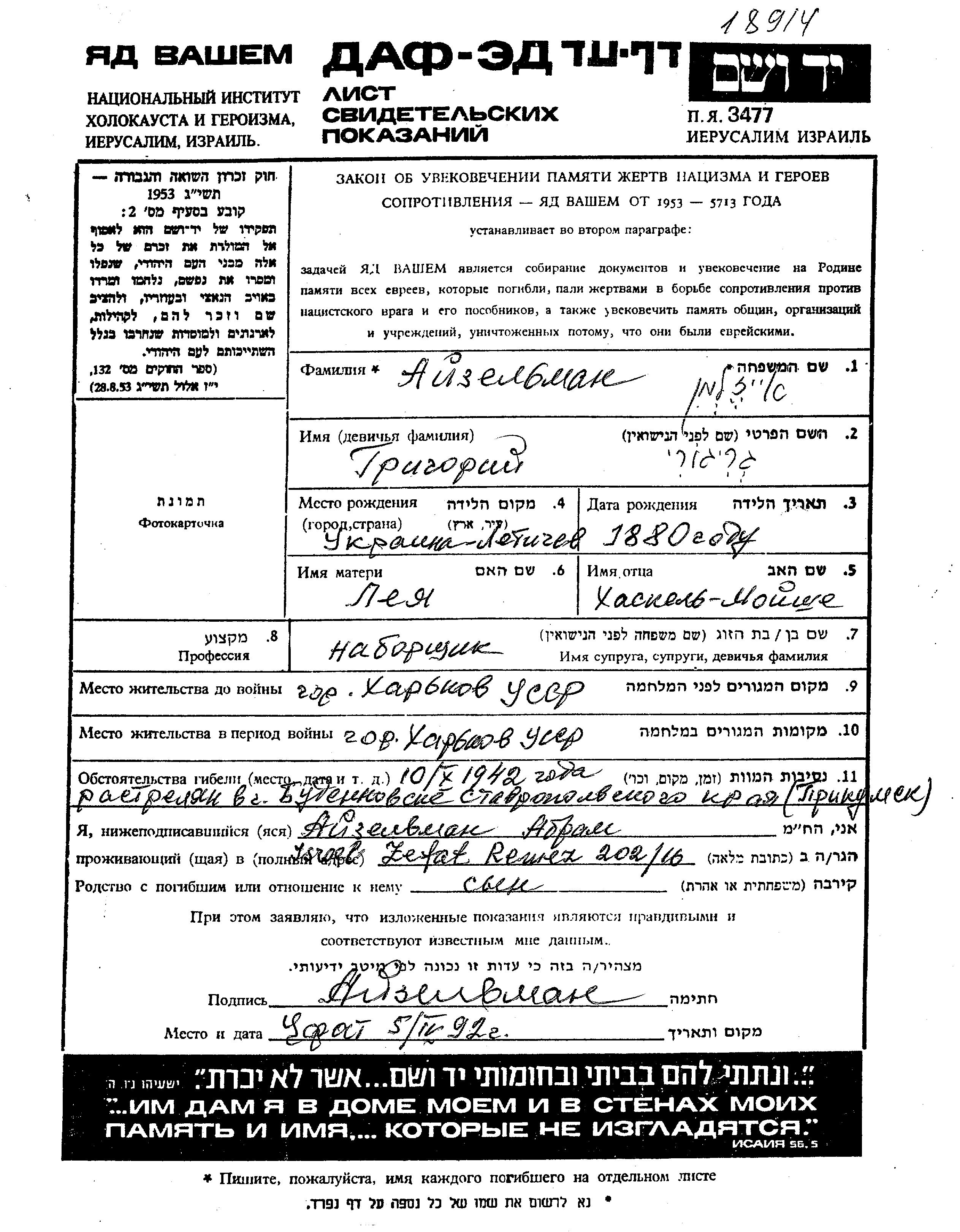 גריגורי נרצח בשואה. מקום המוות: Budennovsk שברוסיה (ברה"מ) בשנת 10/10/1942.