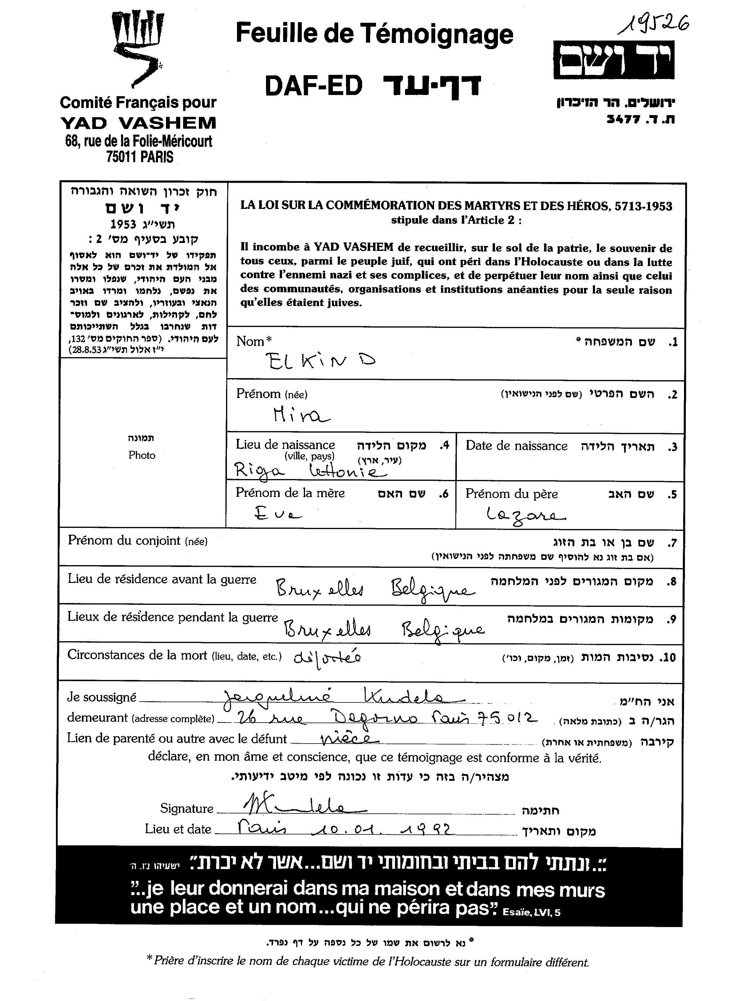 מירה אלקינד נולדה בRiga שבלטביה לLazare ואווה. לפני מלחמת העולם השניה התגוררה בBruxelles שבבלגיה. בזמן המלחמה היא היתה בBruxelles שבבלגיה. מירה נרצחה בשואה.