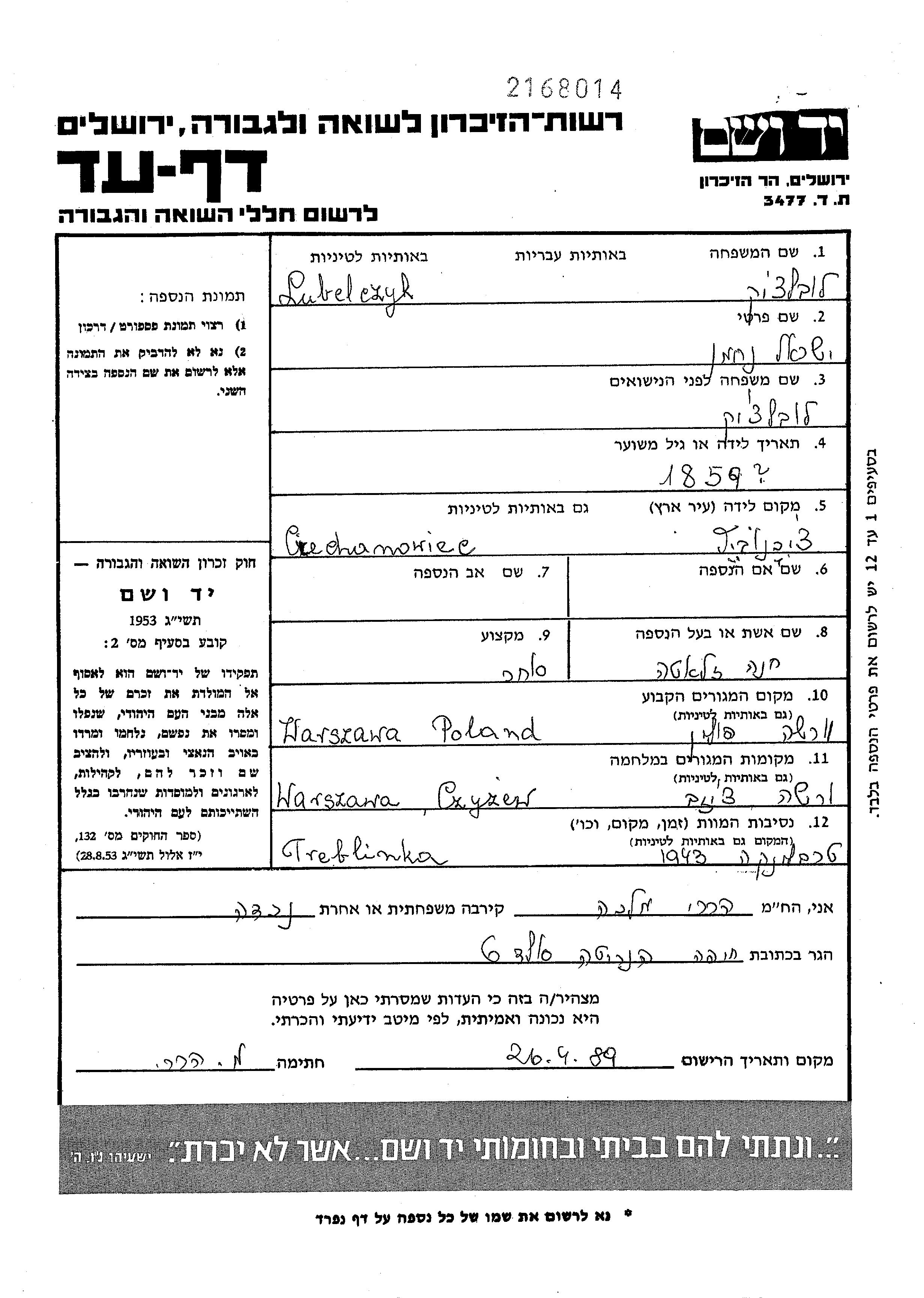 Israel נחמן Lubelczyk נולד בCiechanowiec שבפולין בשנת 1859. הוא היה סוחר ונשוי לחנה זלטה. לפני מלחמת העולם השניה התגורר בWarszawa שבפולין. בזמן המלחמה הוא היה בCzyzew שבפולין.