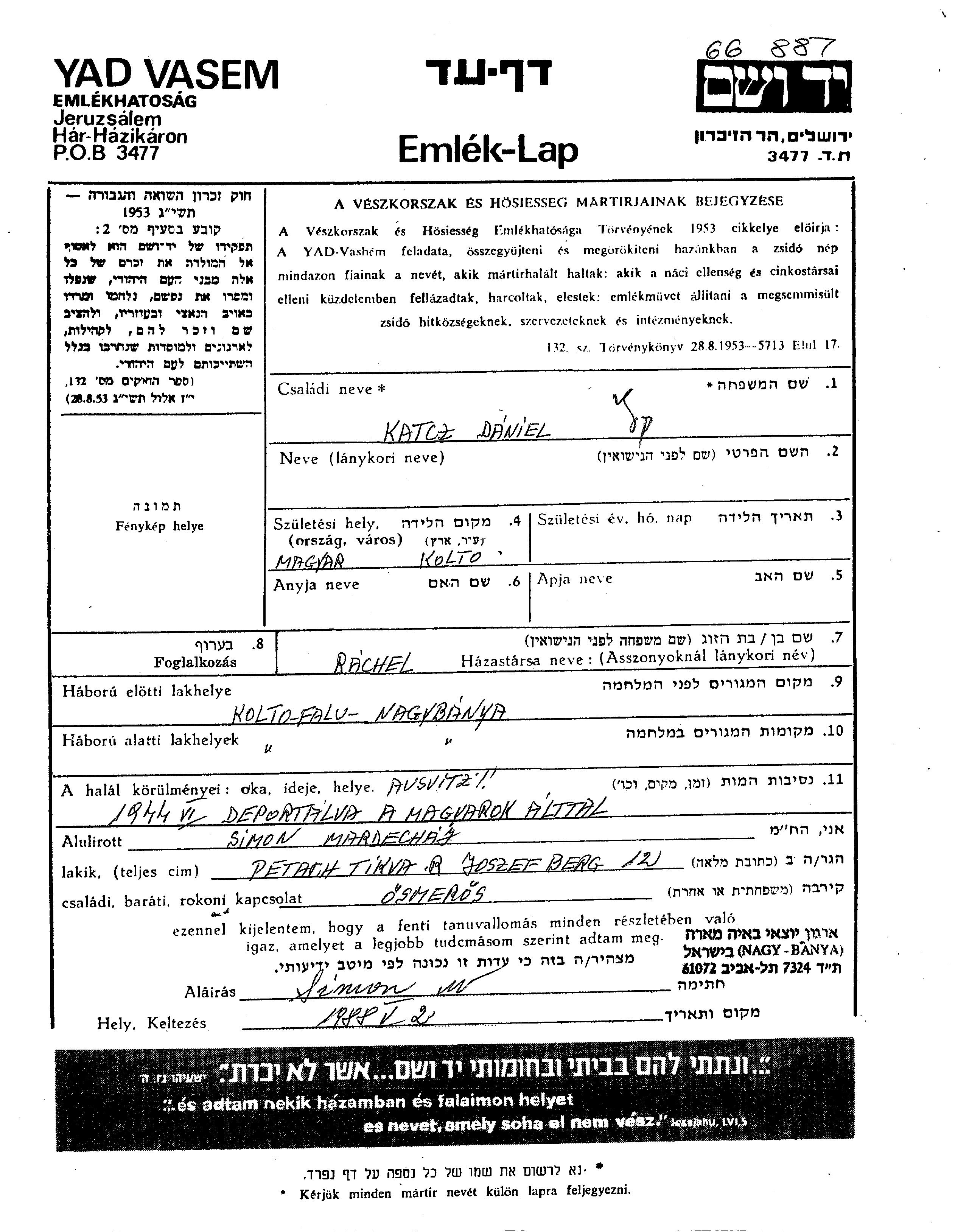 דניאל Katcz נולד בKolto שברומניה. הוא היה נשוי לרחל. לפני מלחמת העולם השניה התגורר בKolto שברומניה. בזמן המלחמה הוא היה בKolto שברומניה.