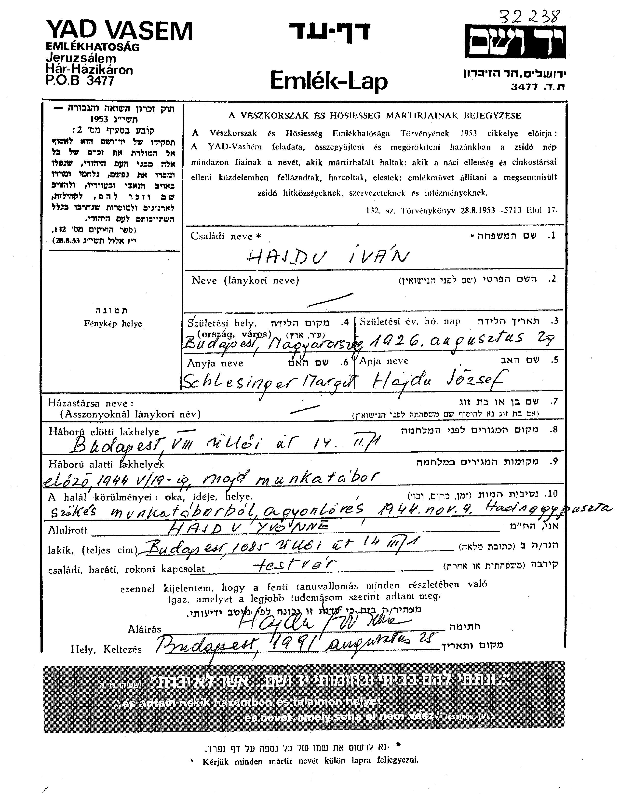 איוון Hajdu נולד בBudapest שבהונגריה בשנת 1926 לJosef וMargit לבית Schlesinger. הוא היה רווק. לפני מלחמת העולם השניה התגורר בBudapest שבהונגריה. בזמן המלחמה הוא היה בBudapest שבהונגריה.