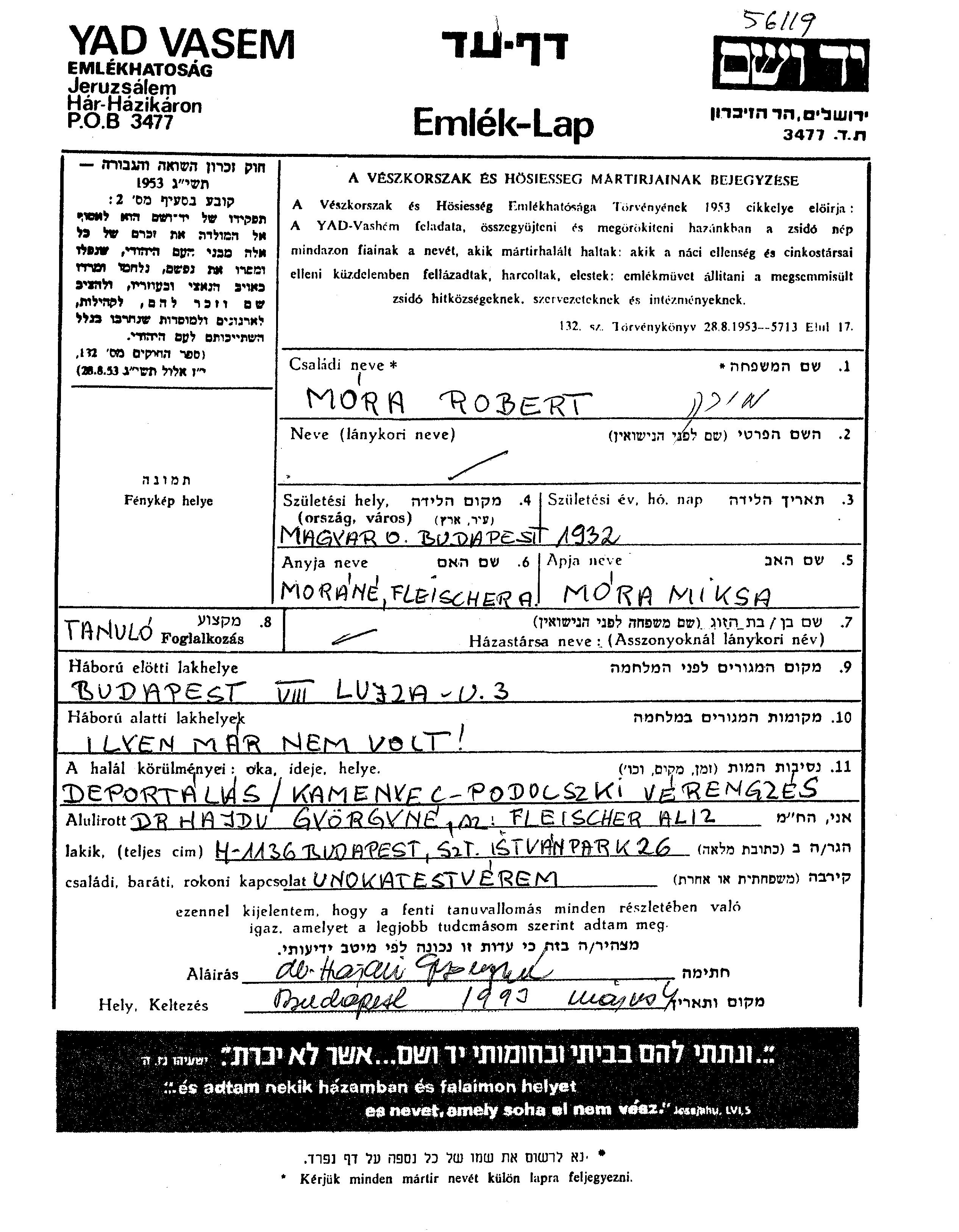 רוברט נרצח בשואה. מקום המוות: Kamenets Podolsk שבאוקראינה (ברה"מ).