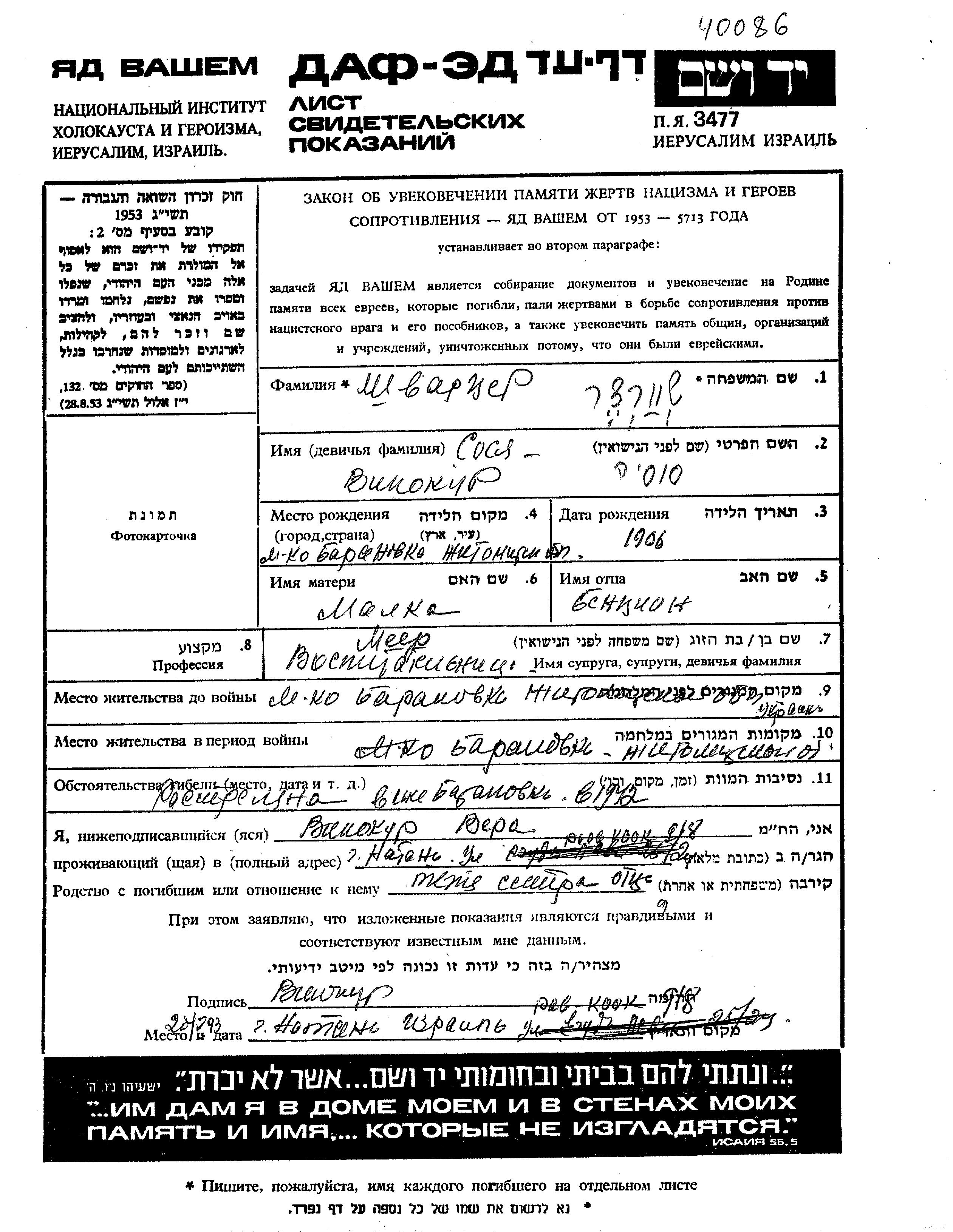 סוסיה שוורצר לבית וינוקור נולדה בBaranovka שבאוקראינה (ברה"מ) בשנת 1906 לבן ציון ומלכה. היא היתה גננת ונשואה לMeer. לפני מלחמת העולם השניה התגוררה בBaranovka שבאוקראינה (ברה"מ). בזמן המלחמה היא היתה בBaranovka שבאוקראינה (ברה"מ). סוסיה נרצחה בשואה. מקום המוות: Baranovka שבאוקראינה (ברה"מ) בשנת 1942.
