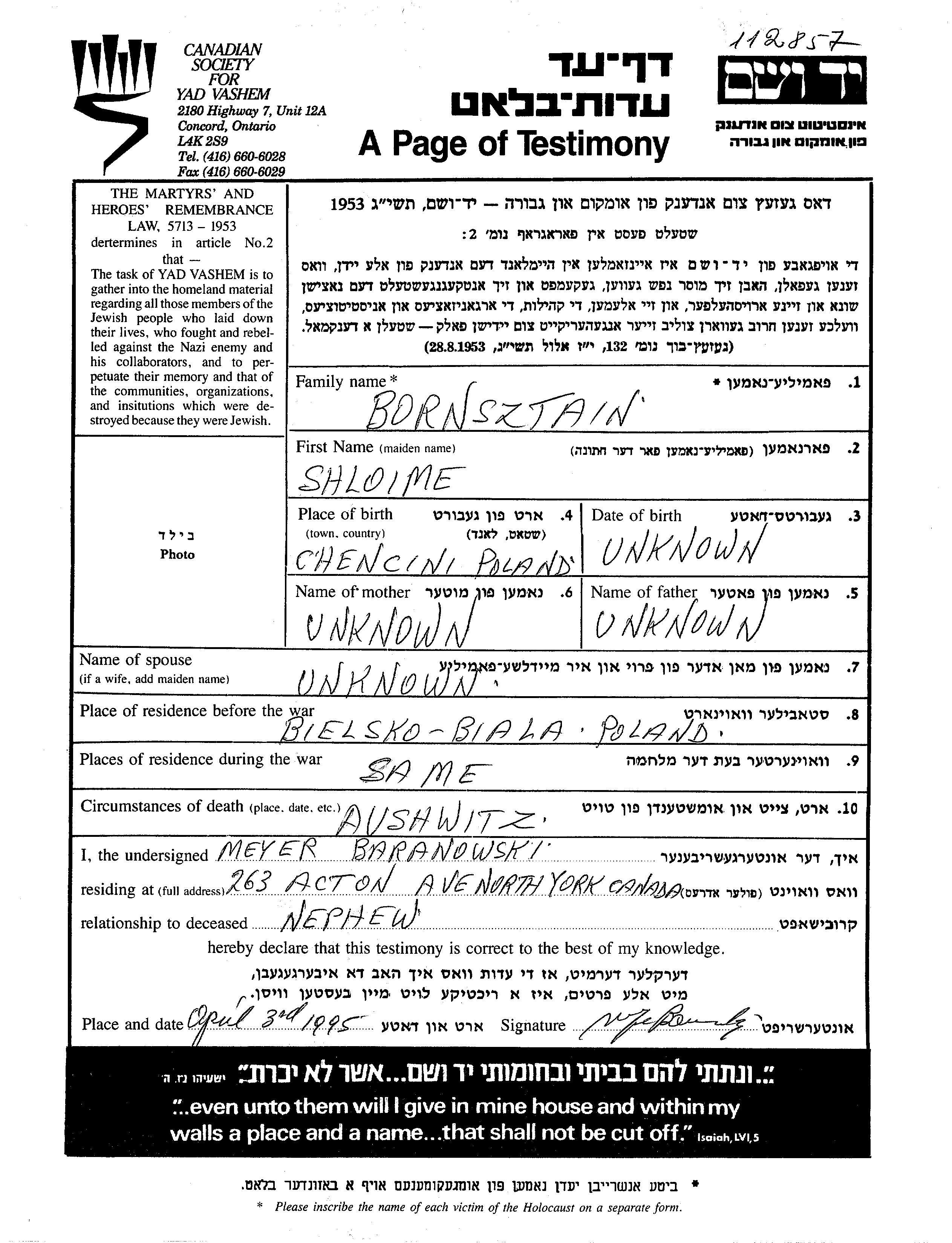 Szloime שלום Bornsztain נולד בChęciny שבפולין. לפני מלחמת העולם השניה התגורר בBielsko Biala שבפולין. בזמן המלחמה הוא היה בBielsko Biala שבפולין.