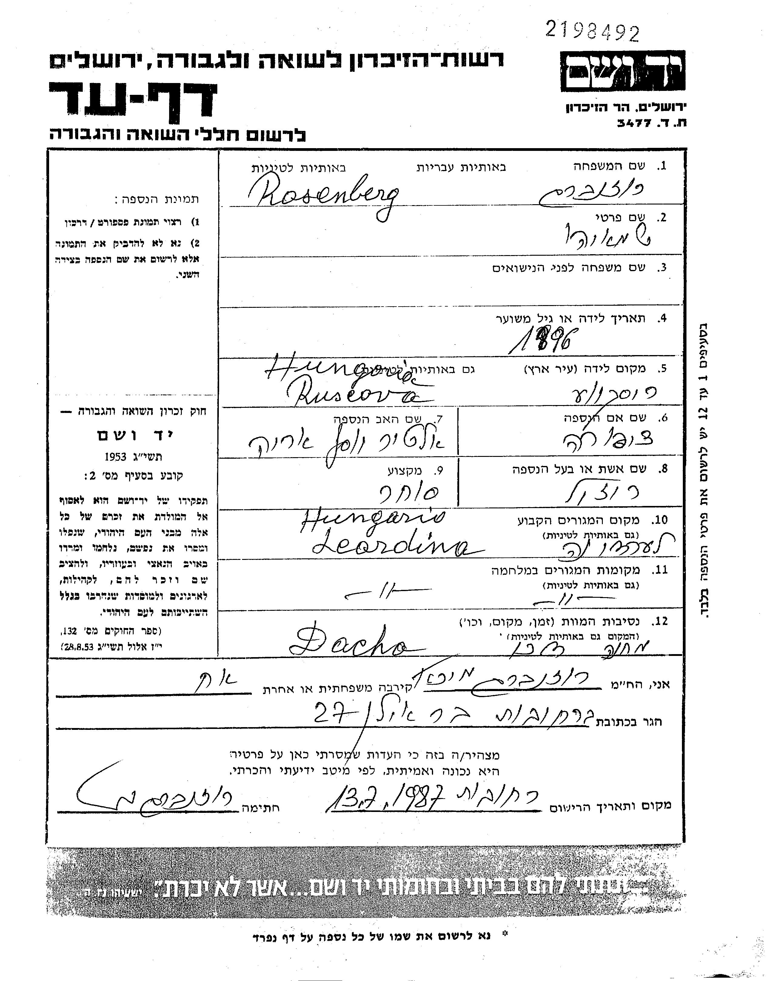 Shemaie שמעיה Rosenberg נולד בRuscova שברומניה בשנת 1896 לאלטר יוסף אריה וצפורה. הוא היה סוחר ונשוי לRaizil. לפני מלחמת העולם השניה התגורר בLeordina שברומניה. בזמן המלחמה הוא היה בLeordina שברומניה. הוא נרצח בשואה. מקום המוות: Dachau שבגרמניה.