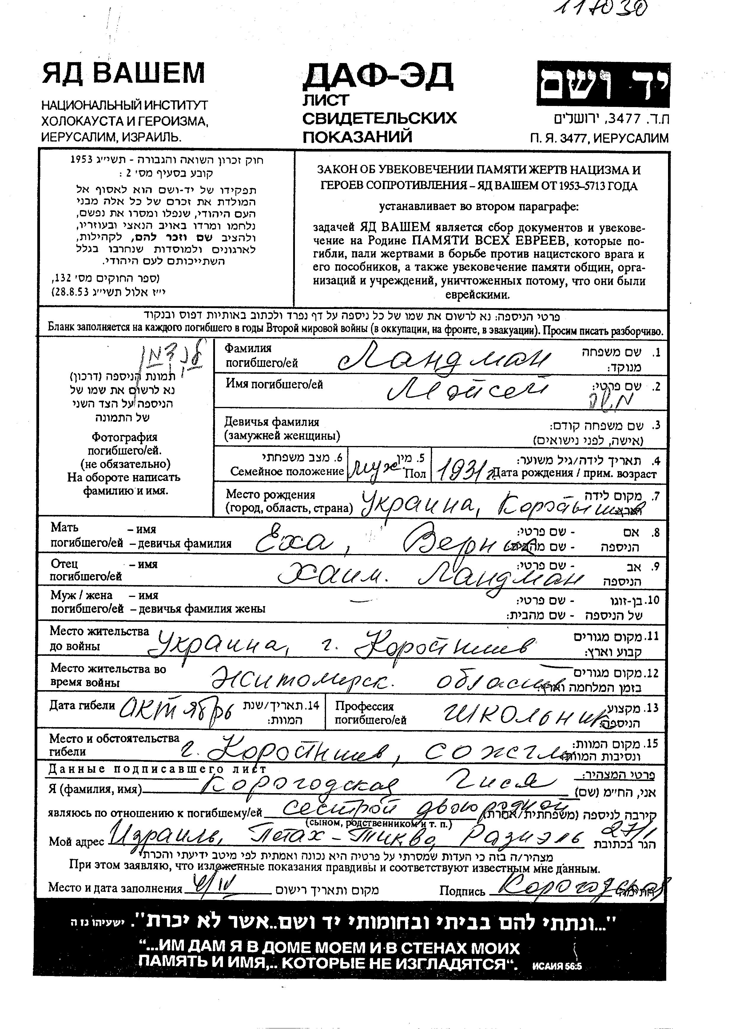 לנדמן מואיסאי 1931 Korostyshev, אוקראינה (ברה"מ) דף-עד
