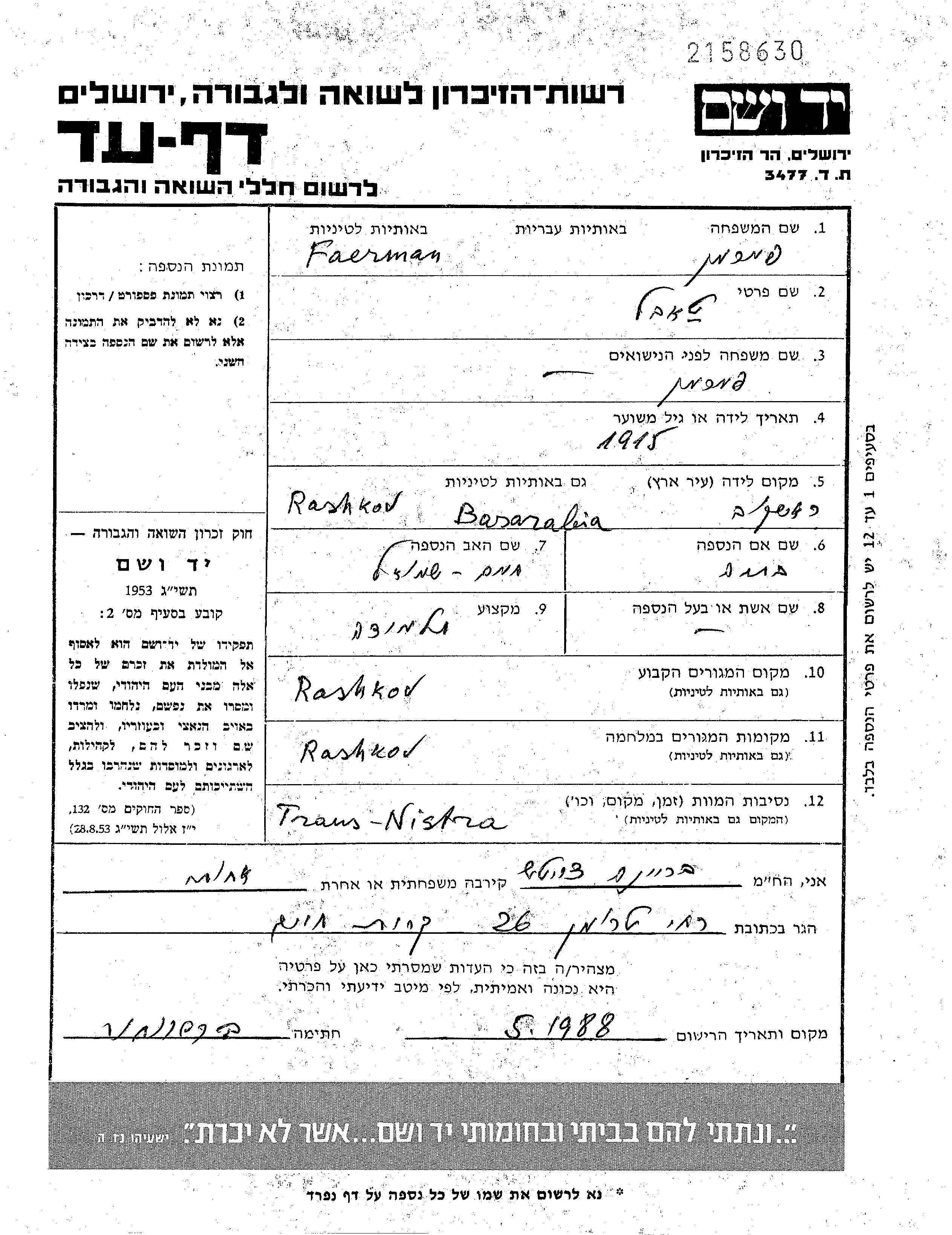 Taibel Faerman נולד בRashkov שברומניה בשנת 1915 לחיים שמואל ובתיה לבית Sklyar. הוא היה תלמיד. לפני מלחמת העולם השניה התגורר בRashkov שברומניה. בזמן המלחמה הוא היה בRashkov שברומניה. הוא נרצח בשואה. מקום המוות: Transnistria שבאוקראינה (ברה"מ).