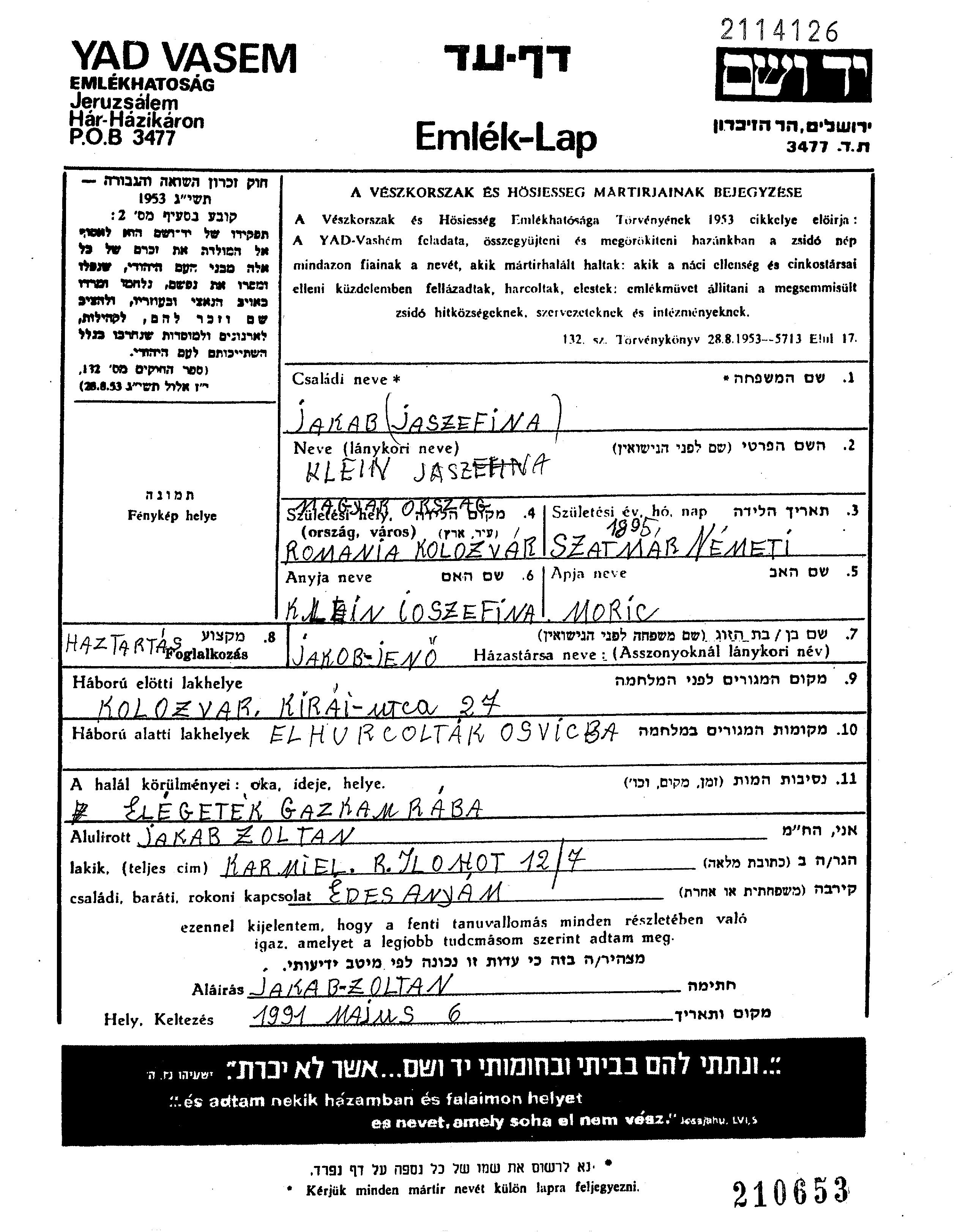 Jaszefina יוזפינה Jakab לבית קליין נולדה בSzatmarnemeti שברומניה לMoric וJoszefina. היא היתה נשואה לJeno. לפני מלחמת העולם השניה התגוררה בKolozsvar שברומניה. בזמן המלחמה היא היתה בTransylvania שברומניה.