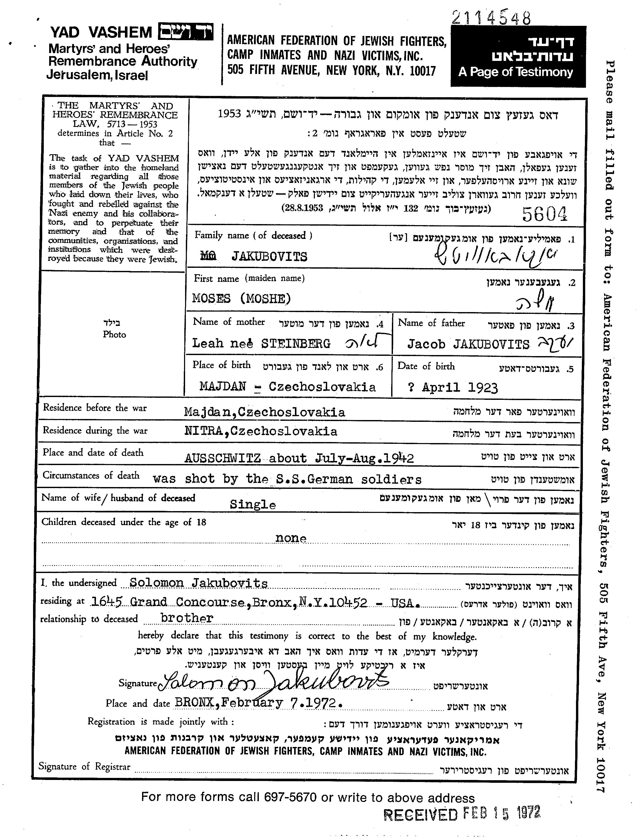 Moses Jakubovits נולד בMajdan שבצ'כוסלובקיה לJacob וLeah לבית Steinberg. הוא היה רווק. לפני מלחמת העולם השניה התגורר בMajdan שבצ'כוסלובקיה. בזמן המלחמה הוא היה בNitra שבצ'כוסלובקיה. הוא נרצח בשואה. מקום המוות: Auschwitz שבפולין.