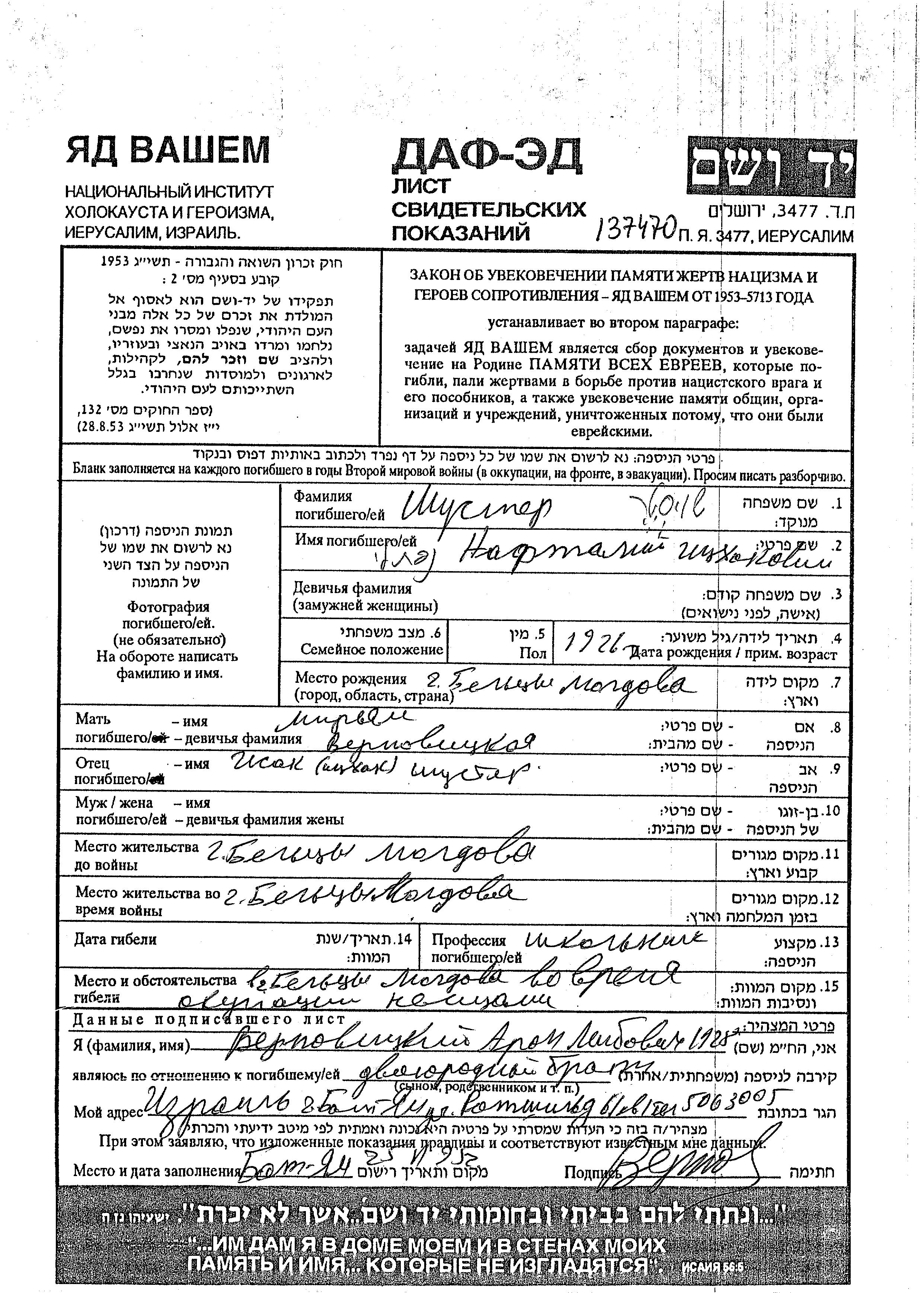 נפתלי נרצח בשואה. מקום המוות: Balti שברומניה.