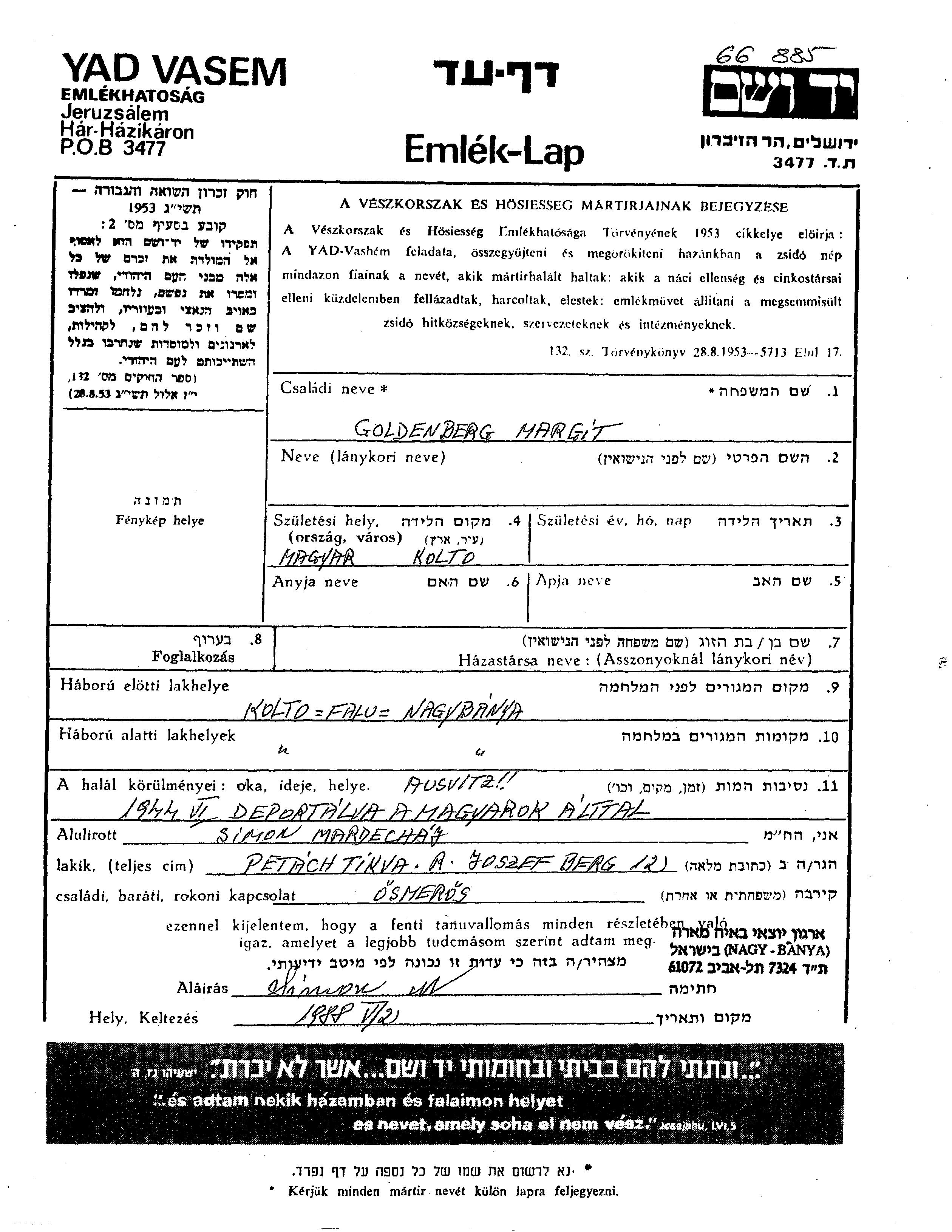 Margit גולדברג נולדה בKolto שברומניה. לפני מלחמת העולם השניה התגוררה בKolto שברומניה. בזמן המלחמה היא היתה בKolto שברומניה. היא נרצחה בשואה. מקום המוות: Auschwitz שבפולין בשנת 1944.