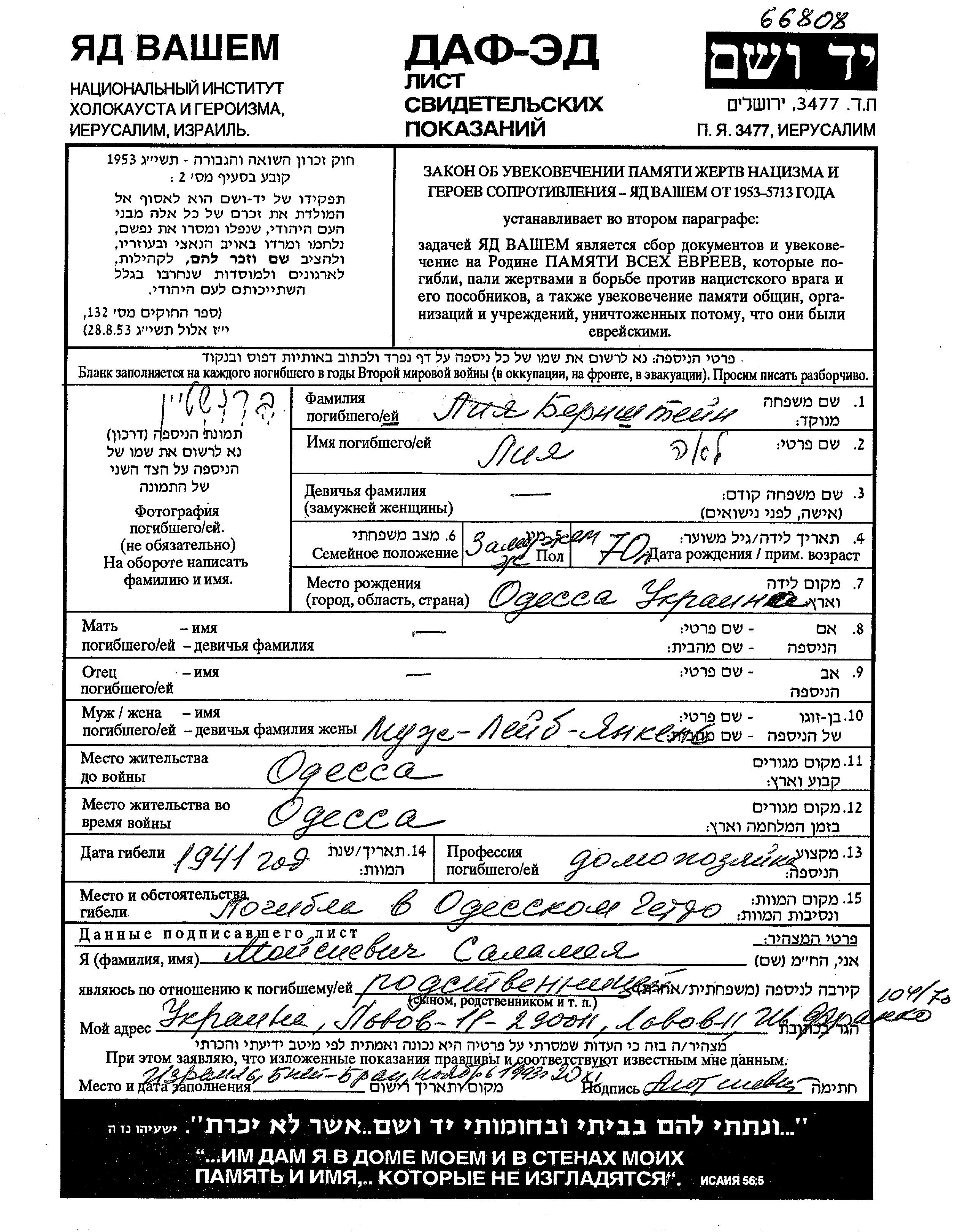 היא נרצחה בשואה. מקום המוות: Odessa שבאוקראינה (ברה"מ) בשנת 1941.