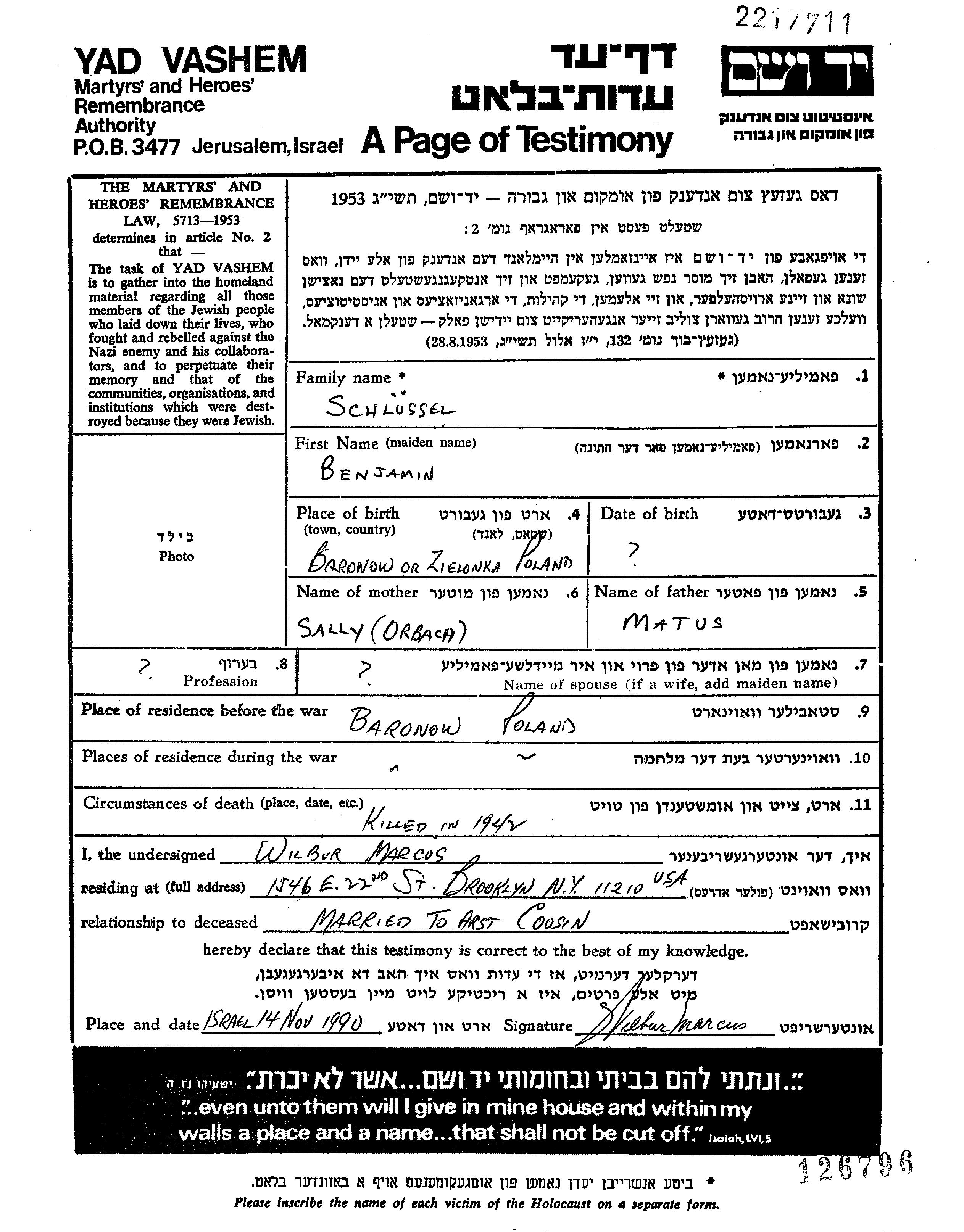 Benjamin Schluessel נולד בLwow שבפולין לMatus וSally לבית Orbach אורבך. לפני מלחמת העולם השניה התגורר בBaranov שבפולין. בזמן המלחמה הוא היה בBaranov שבפולין. הוא נרצח בשואה.