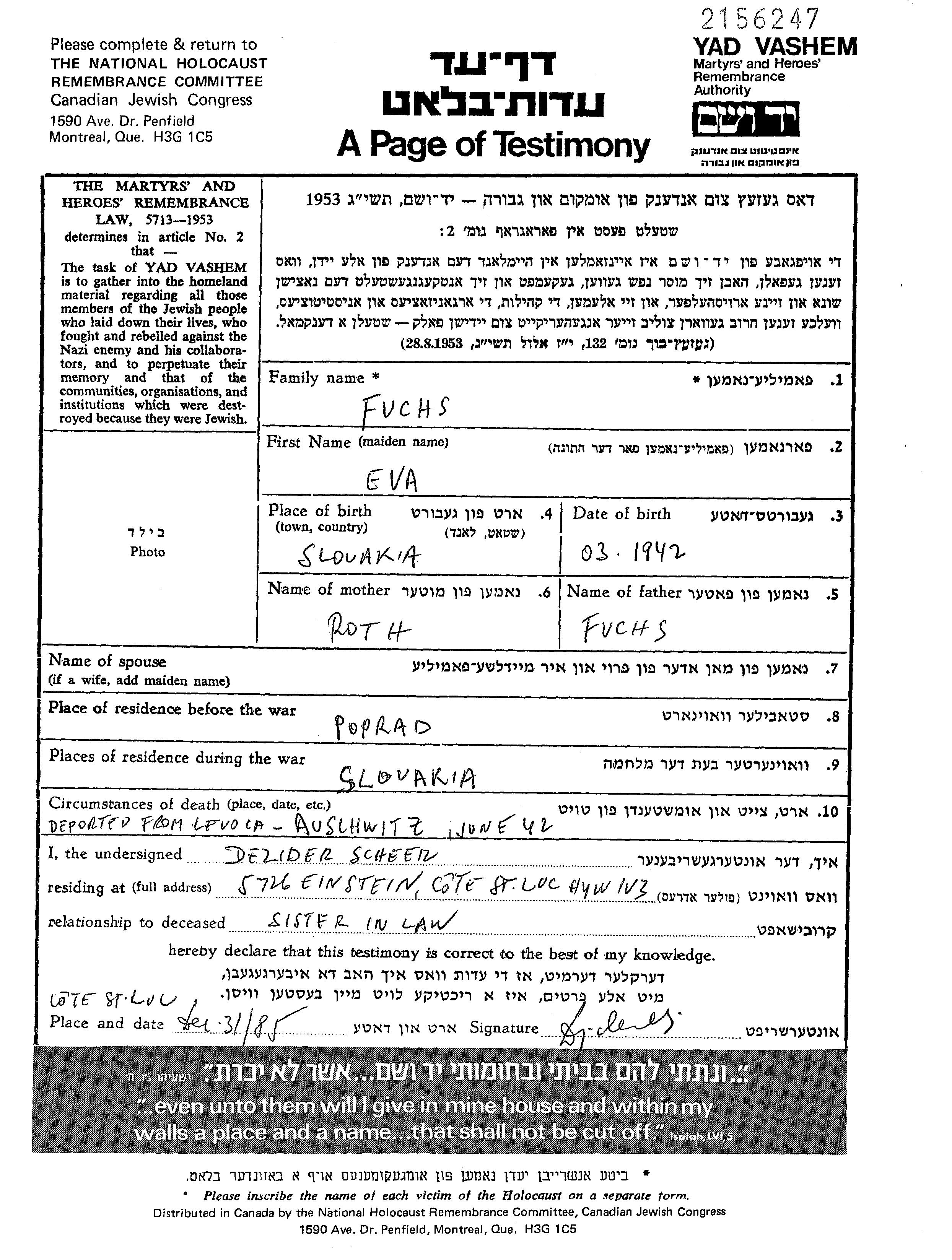 אווה Fuchs נולדה בSlovakia שבצ'כוסלובקיה בשנת 1942. היא היתה ילדה. לפני מלחמת העולם השניה התגוררה בPoprad שבצ'כוסלובקיה. בזמן המלחמה היא היתה בLevoca שבצ'כוסלובקיה.