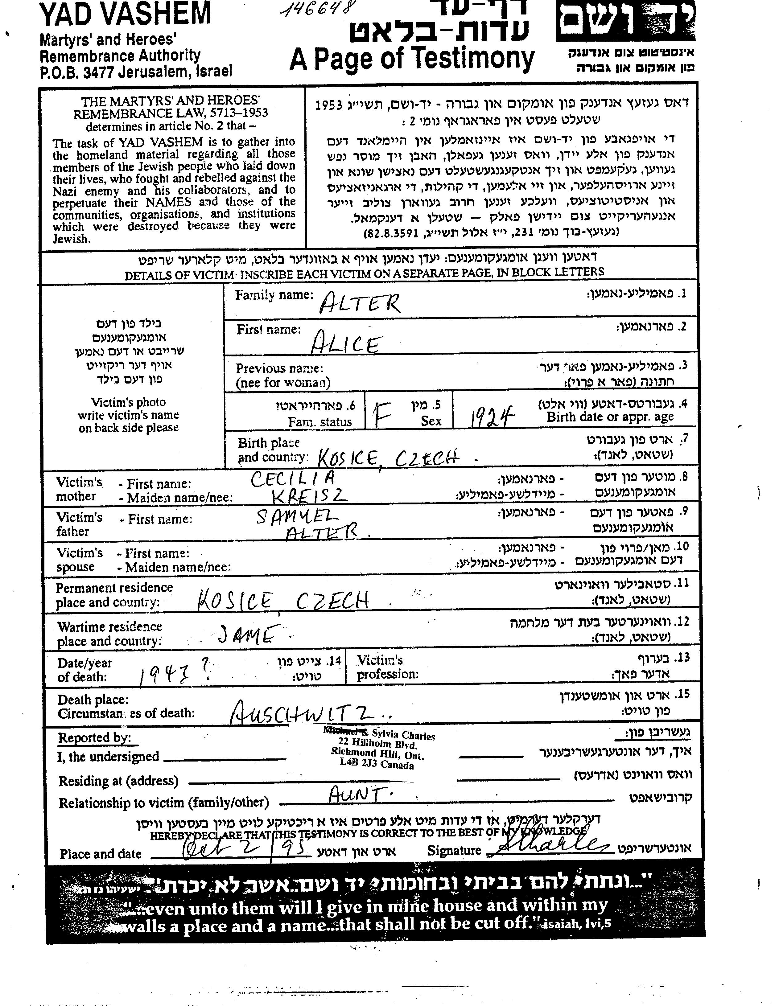 Alice אלטר נולדה בKosice שבצ'כוסלובקיה בשנת 1924 לסמואל וCecilia לבית Kreisz. היא היתה רווקה. לפני מלחמת העולם השניה התגוררה בKosice שבצ'כוסלובקיה. בזמן המלחמה היא היתה בKosice שבצ'כוסלובקיה.