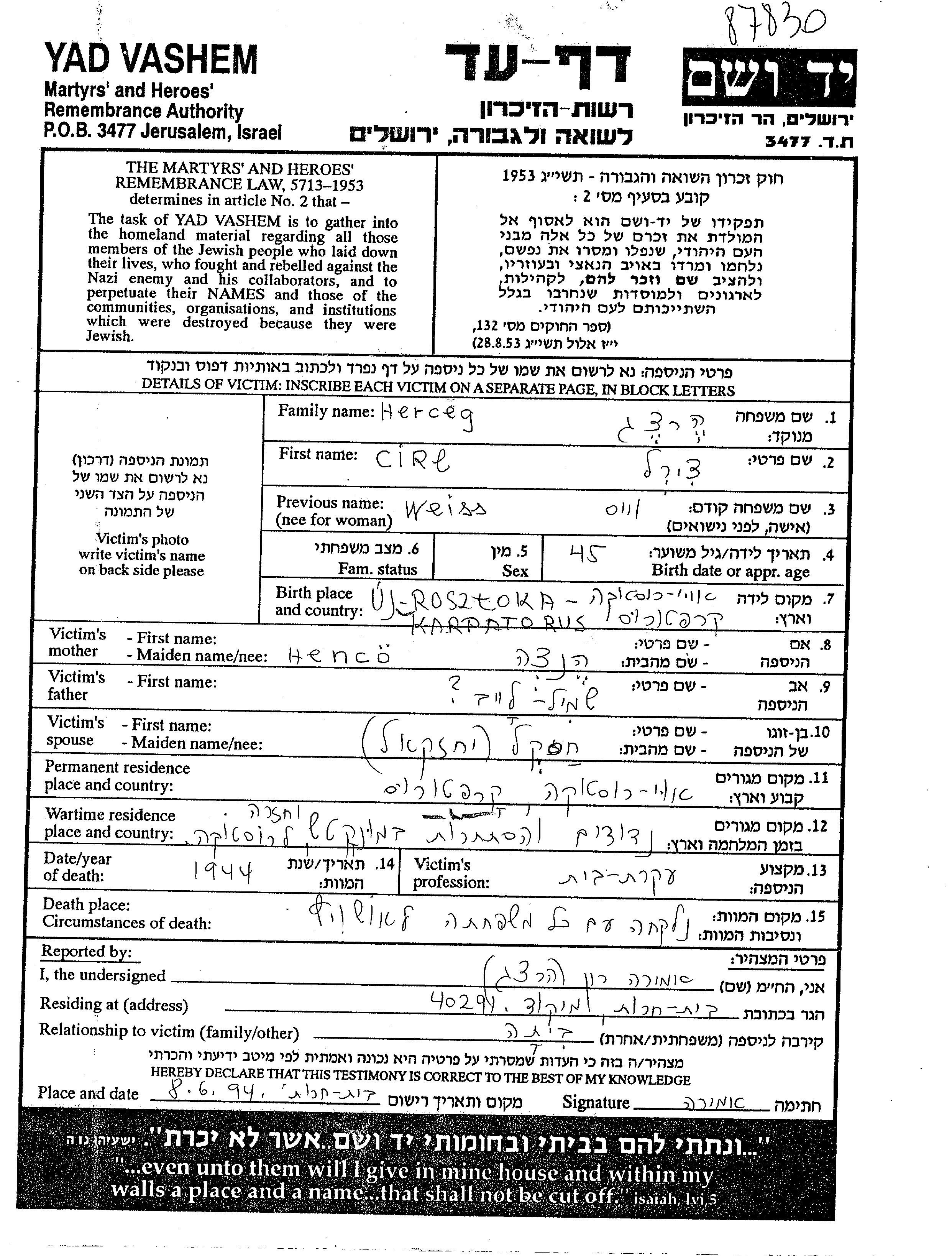 Cirl Herceg לבית Weiss נולדה בUjrosztoka שבצ'כוסלובקיה בשנת 1899 לMinco. היא היתה עקרת בית ונשואה ליחזקאל. לפני מלחמת העולם השניה התגוררה בUjrosztoka שבצ'כוסלובקיה. בזמן המלחמה היא היתה בUjrosztoka שבצ'כוסלובקיה.