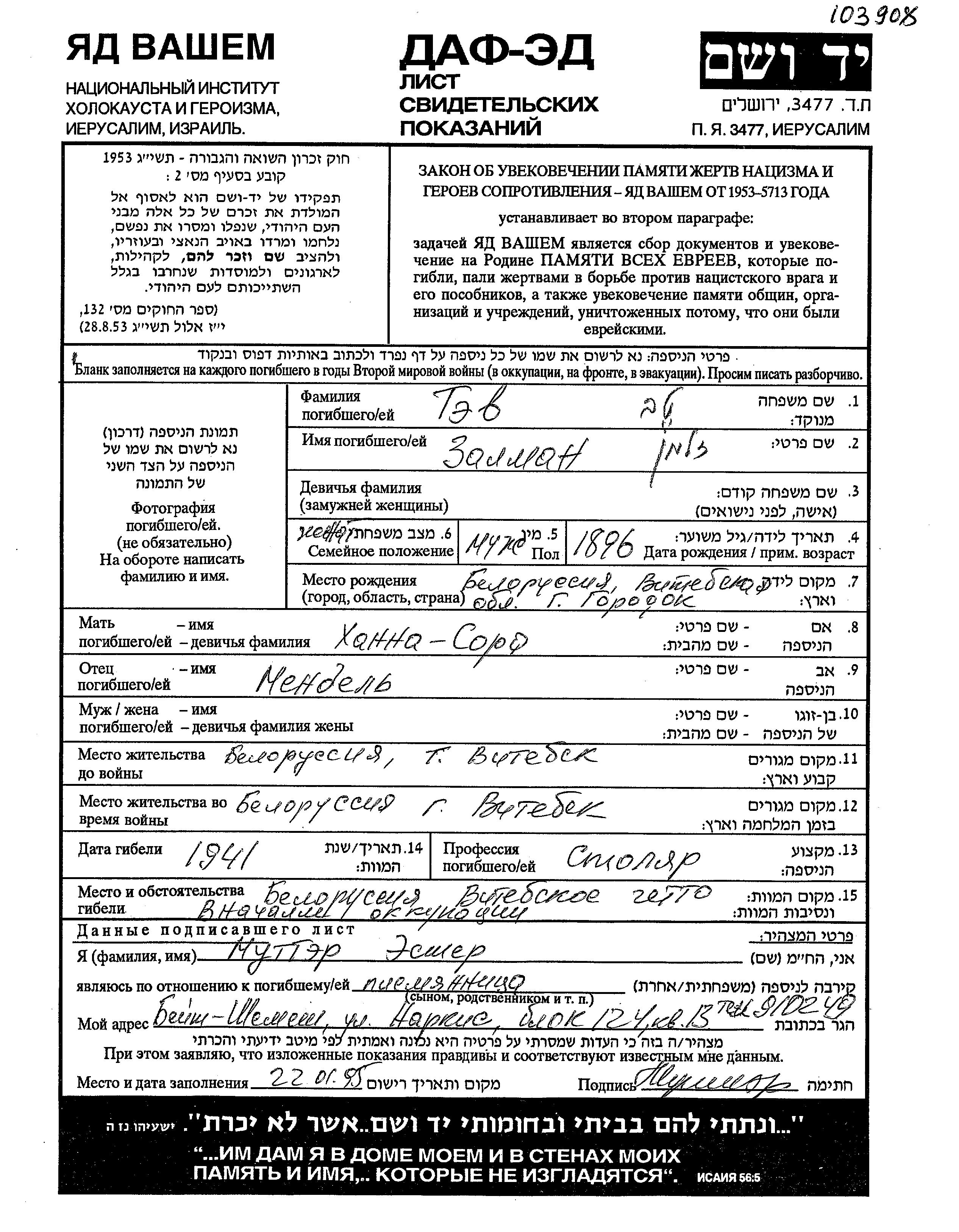 זלמן טב נולד בGorodok שבביאלורוסיה (ברה"מ) בשנת 1896 למנדל וSora חנה. הוא היה נגר ונשוי. לפני מלחמת העולם השניה התגורר בVitebsk שבביאלורוסיה (ברה"מ). בזמן המלחמה הוא היה בVitebsk שבביאלורוסיה (ברה"מ). זלמן נרצח בשואה. מקום המוות: Vitebsk שבביאלורוסיה (ברה"מ) בשנת 1941.