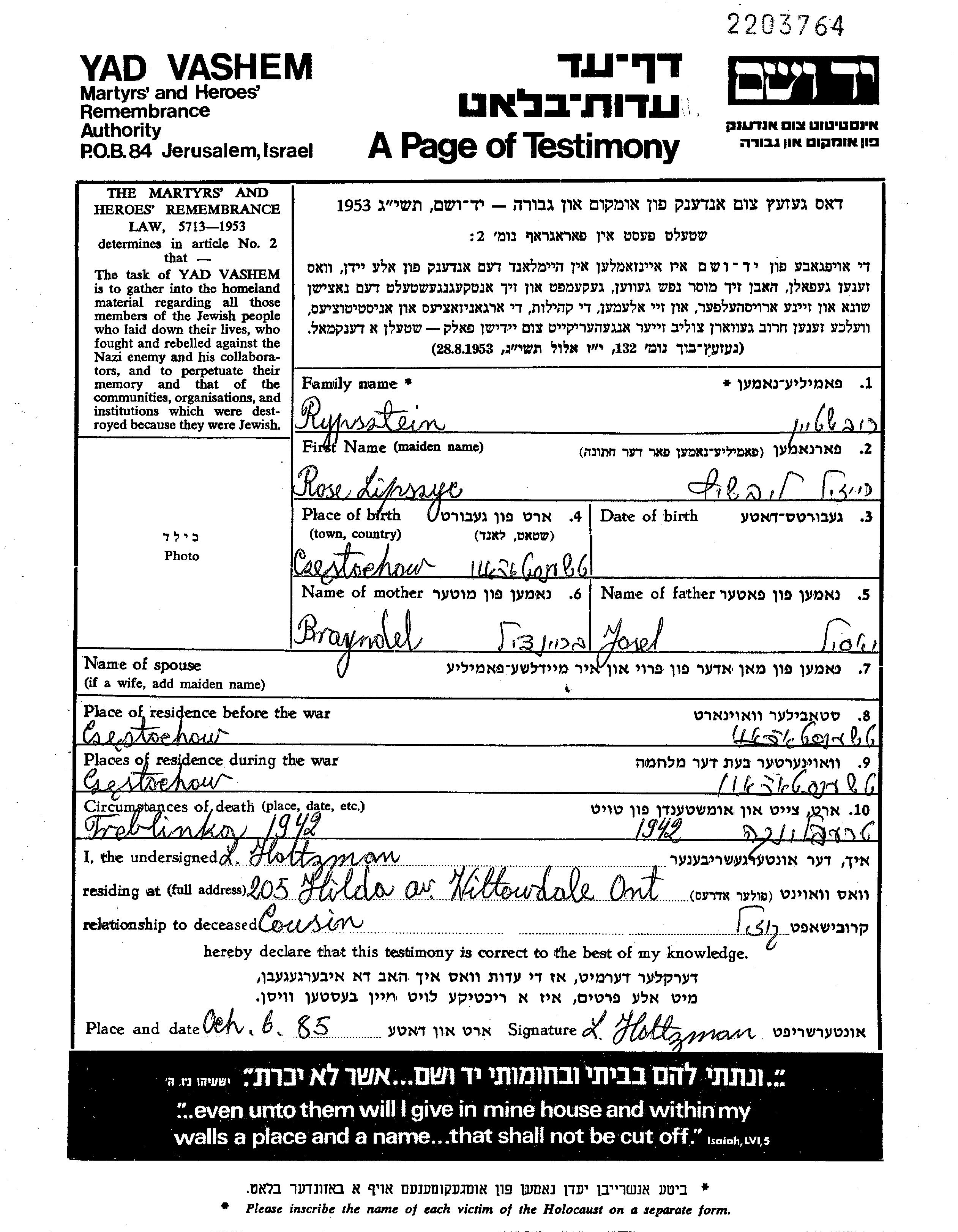 רייזיל Rypsztein לבית Lipszyc נולדה בCzestochowa שבפולין לJasel וBrayndel. היא היתה נשואה. לפני מלחמת העולם השניה התגוררה בCzestochowa שבפולין. בזמן המלחמה היא היתה בCzestochowa שבפולין.