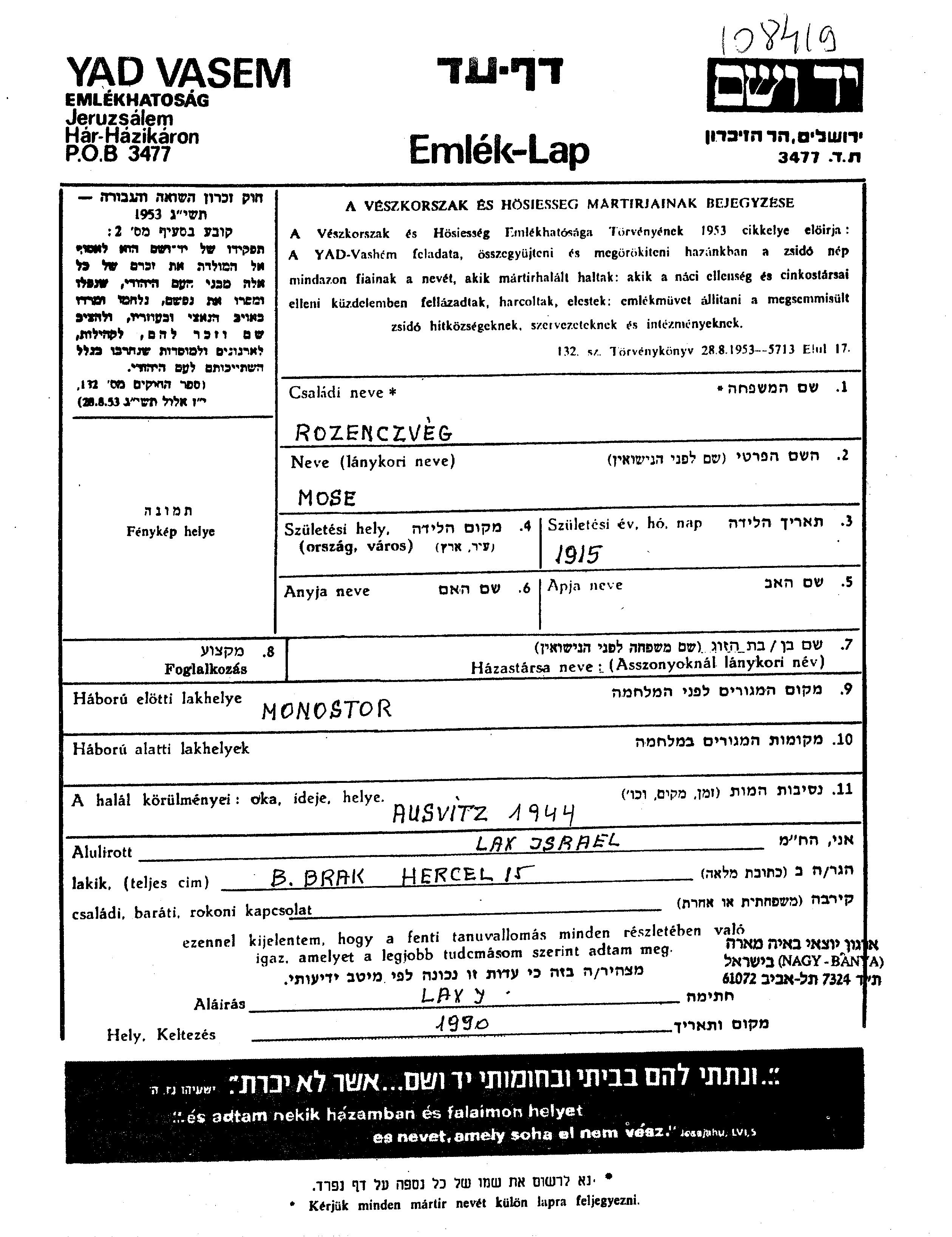 Rosenczvieg Mose 1915 Monostor, רומניה דף-עד