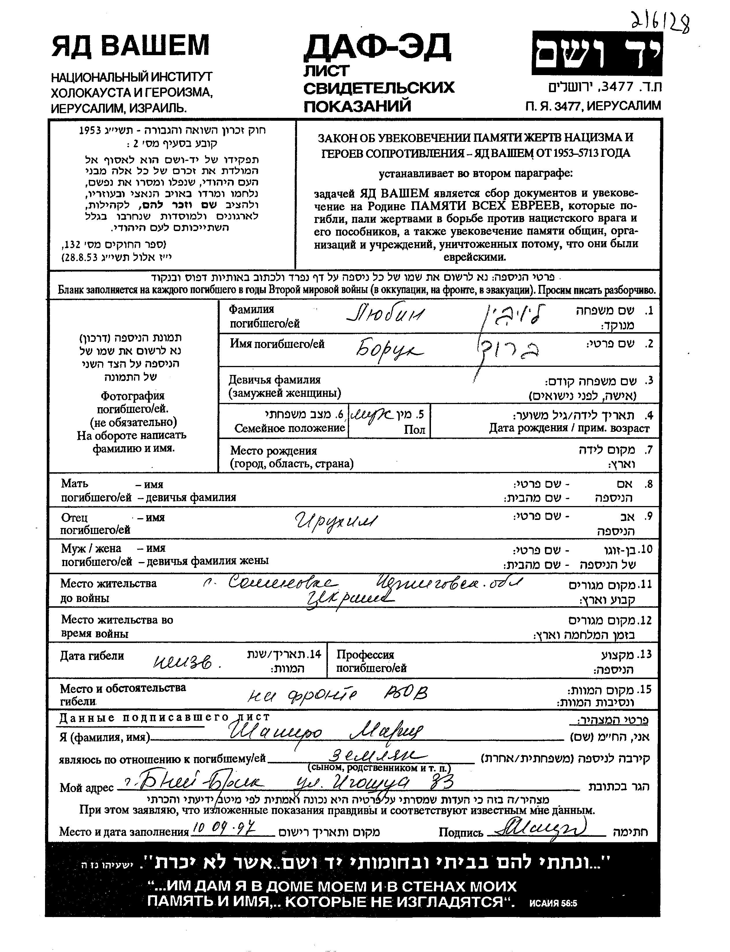 חיפוש שם מוסר דף העד. חיפוש לפי כל שם פרטי, כולל כינוי או שם חיבה
