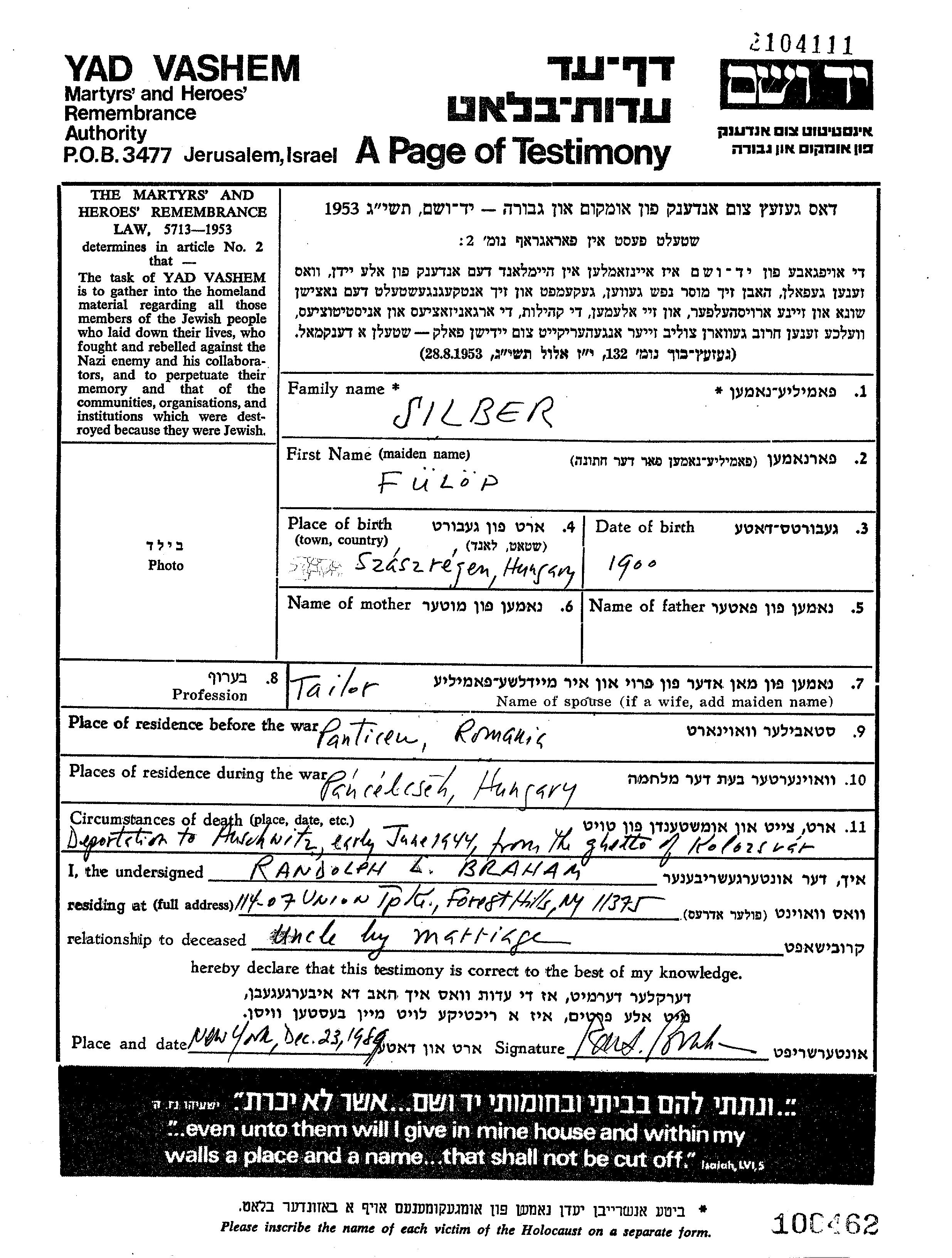 Fulop Silber נולד בSzaszregen שברומניה בשנת 1900. הוא היה חייט ונשוי לSzerena לבית כץ. לפני מלחמת העולם השניה התגורר בPanticeu שברומניה. בזמן המלחמה הוא היה בKolozsvar שברומניה.