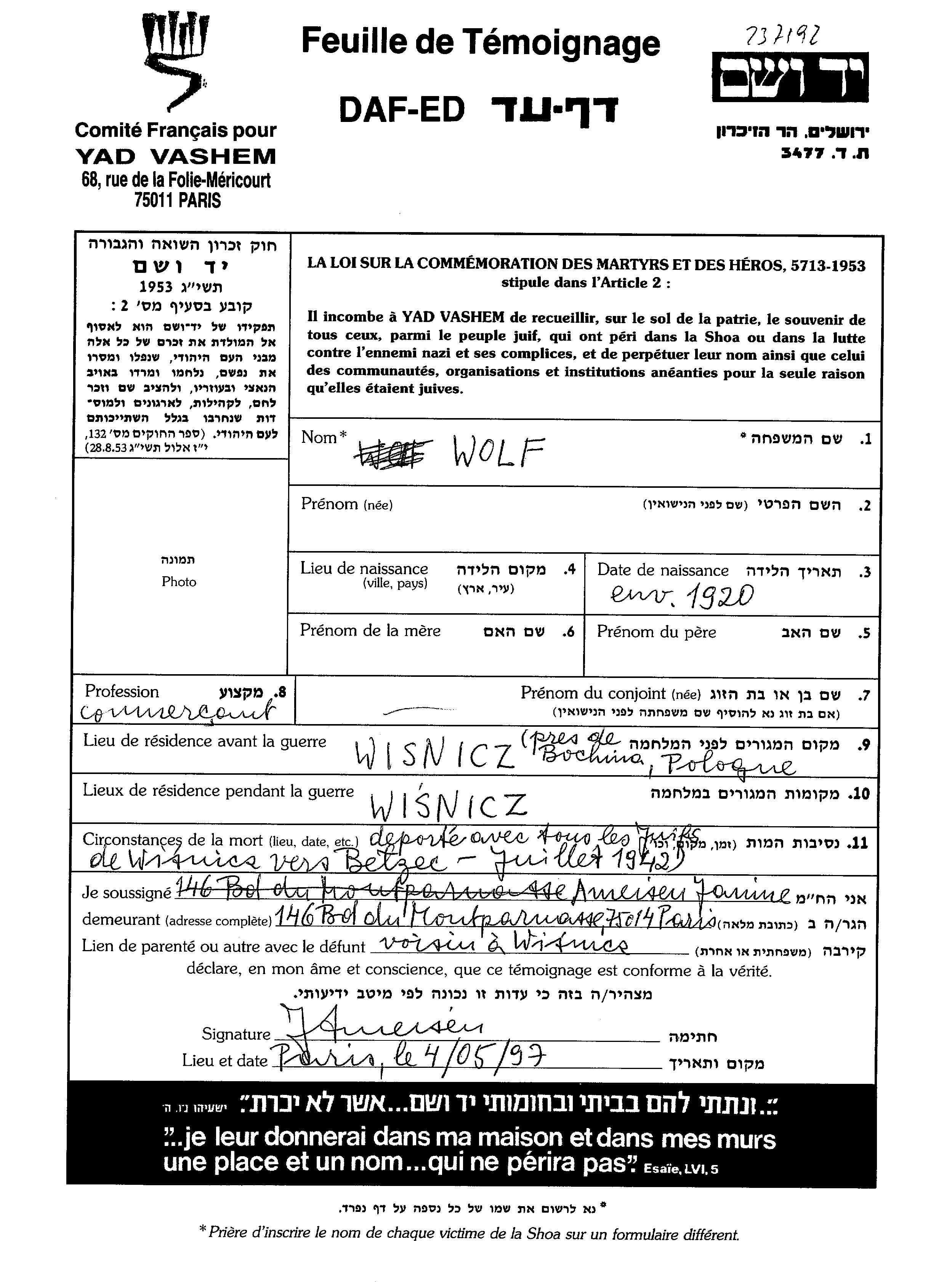 שם פרטי לא ידוע Wolf נולד בשנת 1920. לפני מלחמת העולם השניה התגורר בWisnicz שבפולין. בזמן המלחמה הוא היה בWisnicz שבפולין. הוא נרצח בשואה. מקום המוות: Belzec שבפולין בשנת 1942.