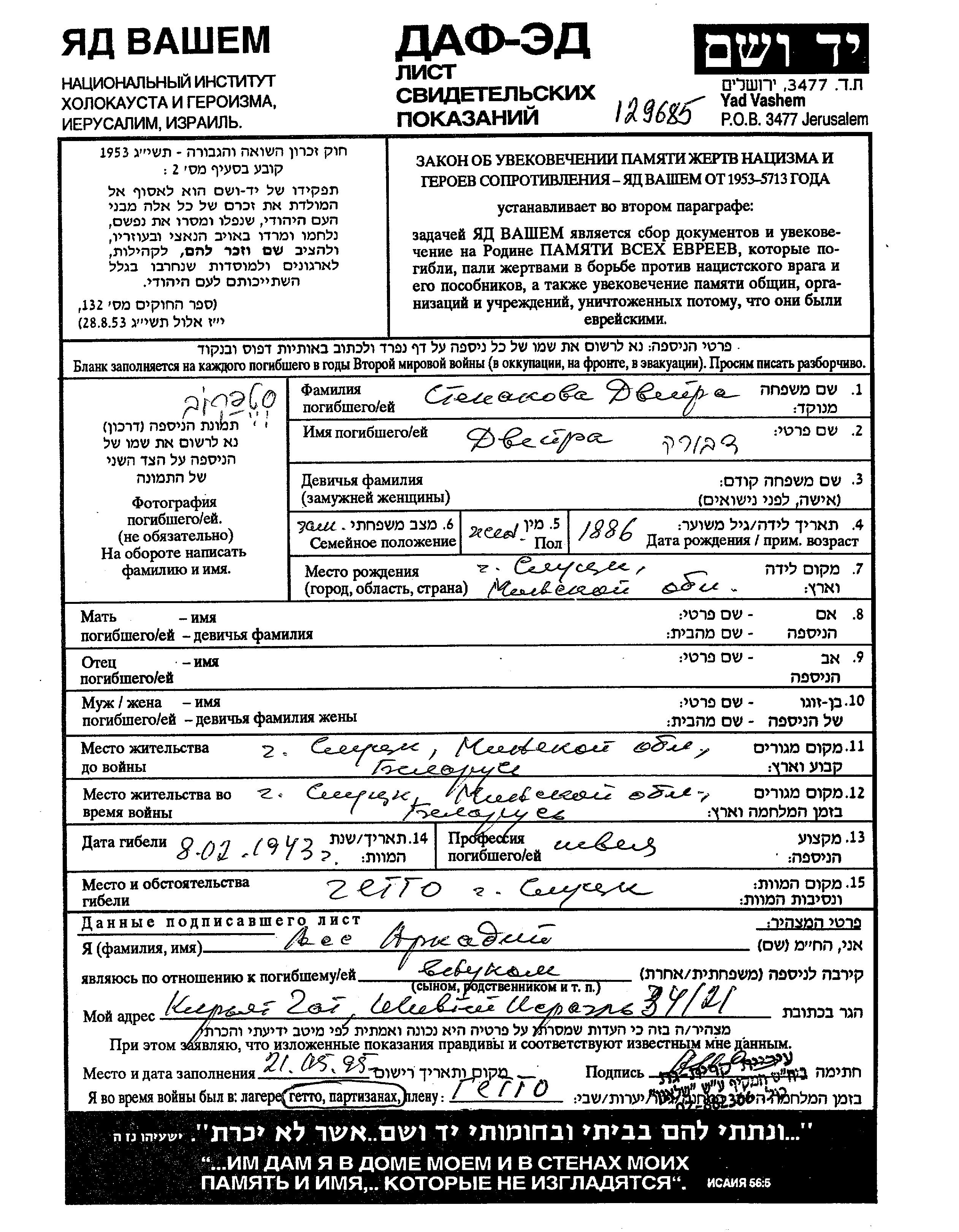 היא נרצחה בשואה. מקום המוות: Slutsk שבביאלורוסיה (ברה"מ) בשנת 08/02/1943.