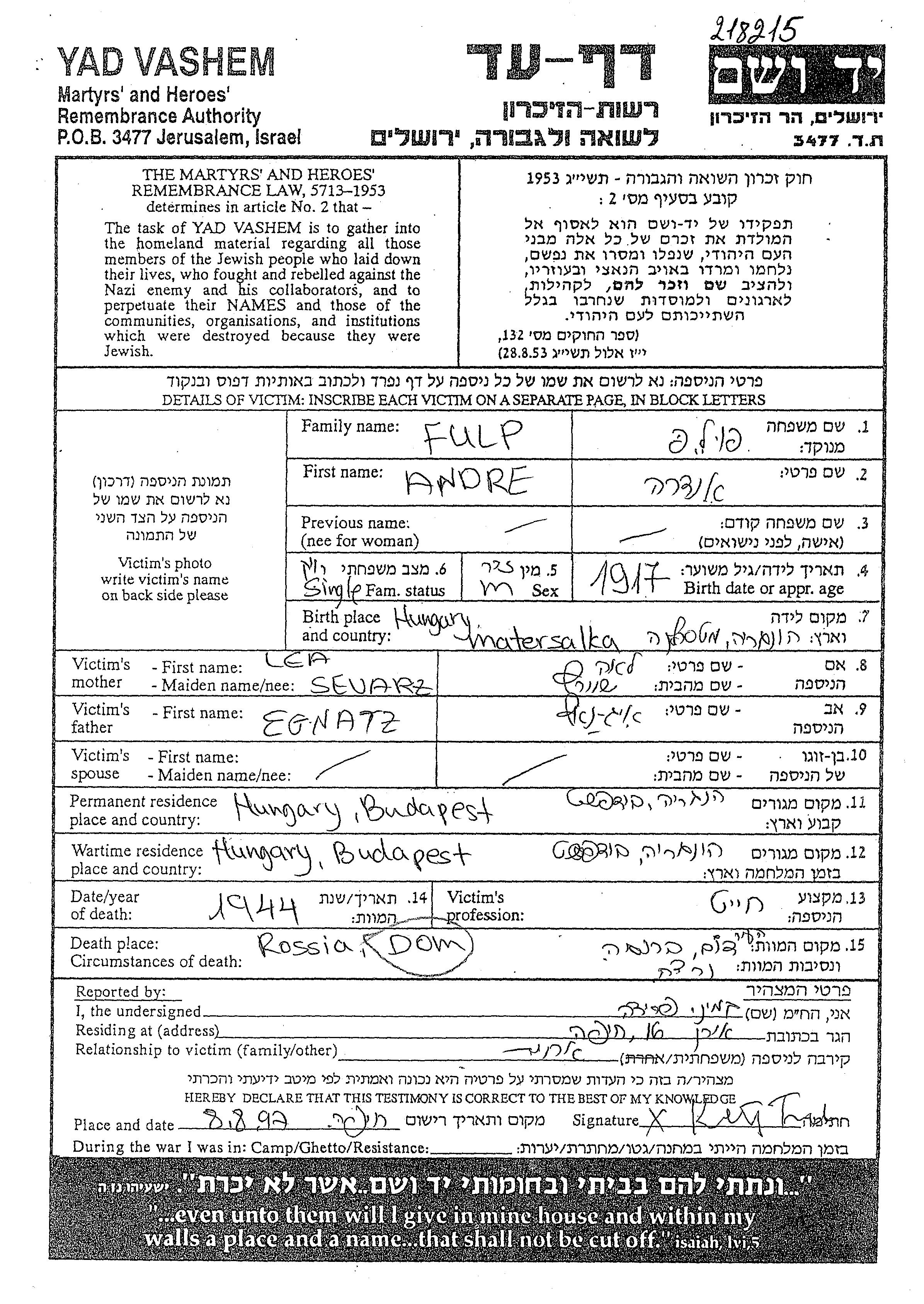 Andre אנדרה Fulp נולד בMateszalka שבהונגריה בשנת 1917 לEgnatz ולאה לבית Sevarz. הוא היה חייט ורווק. לפני מלחמת העולם השניה התגורר בBudapest שבהונגריה. בזמן המלחמה הוא היה בBudapest שבהונגריה.