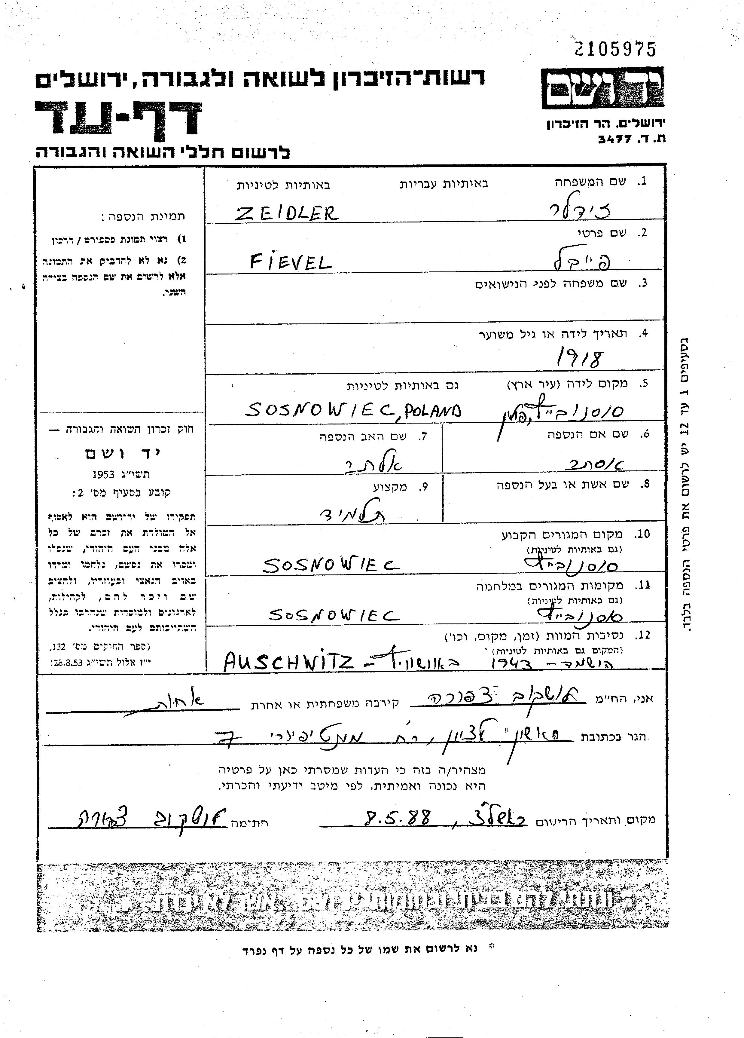 זיידלר Fievel 1918 Sosnowiec, פולין דף-עד