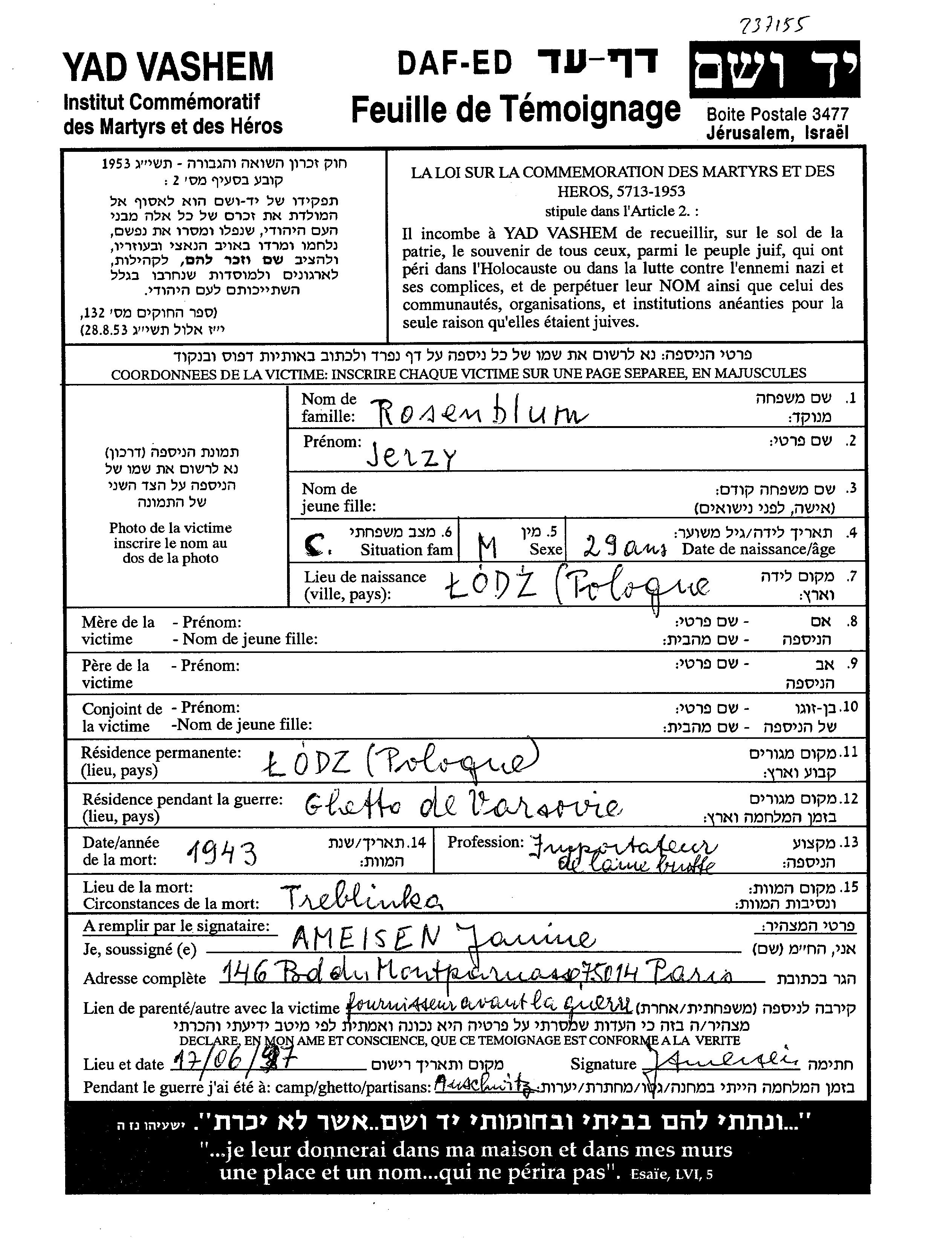 Jerzy ירזי Rosenblum נולד בLodz שבפולין. הוא היה סוחר ורווק. לפני מלחמת העולם השניה התגורר בLodz שבפולין. בזמן המלחמה הוא היה בWarszawa שבפולין.