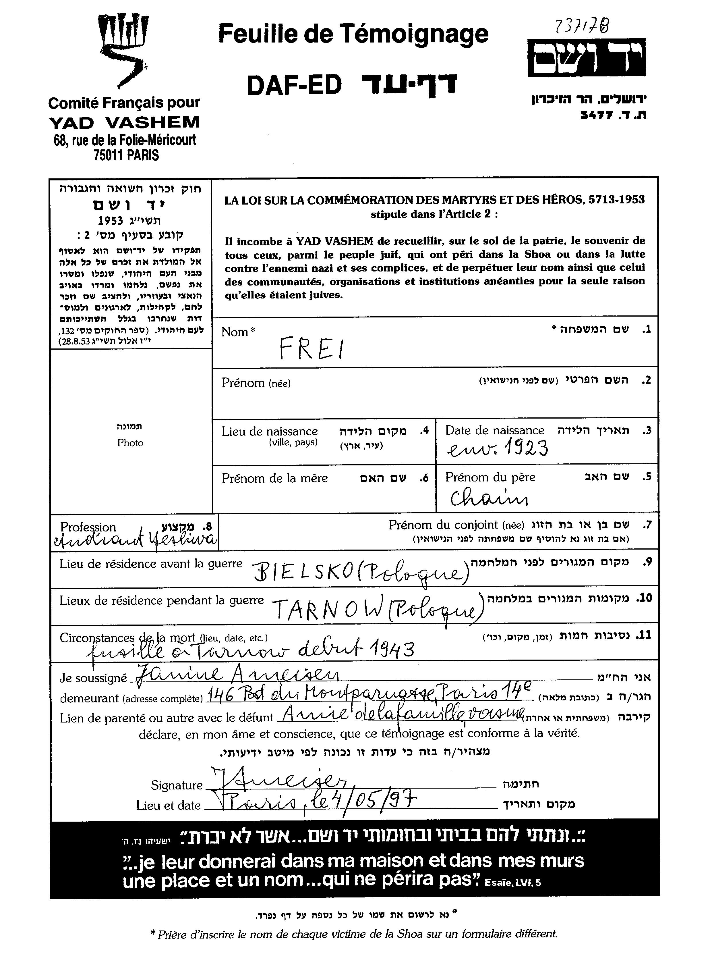 שם פרטי לא ידוע פריי נולד בBielsko שבפולין בשנת 1923 לחיים. הוא היה תלמיד ישיבה ורווק. לפני מלחמת העולם השניה התגורר בBielsko שבפולין. בזמן המלחמה הוא היה בTarnow שבפולין.