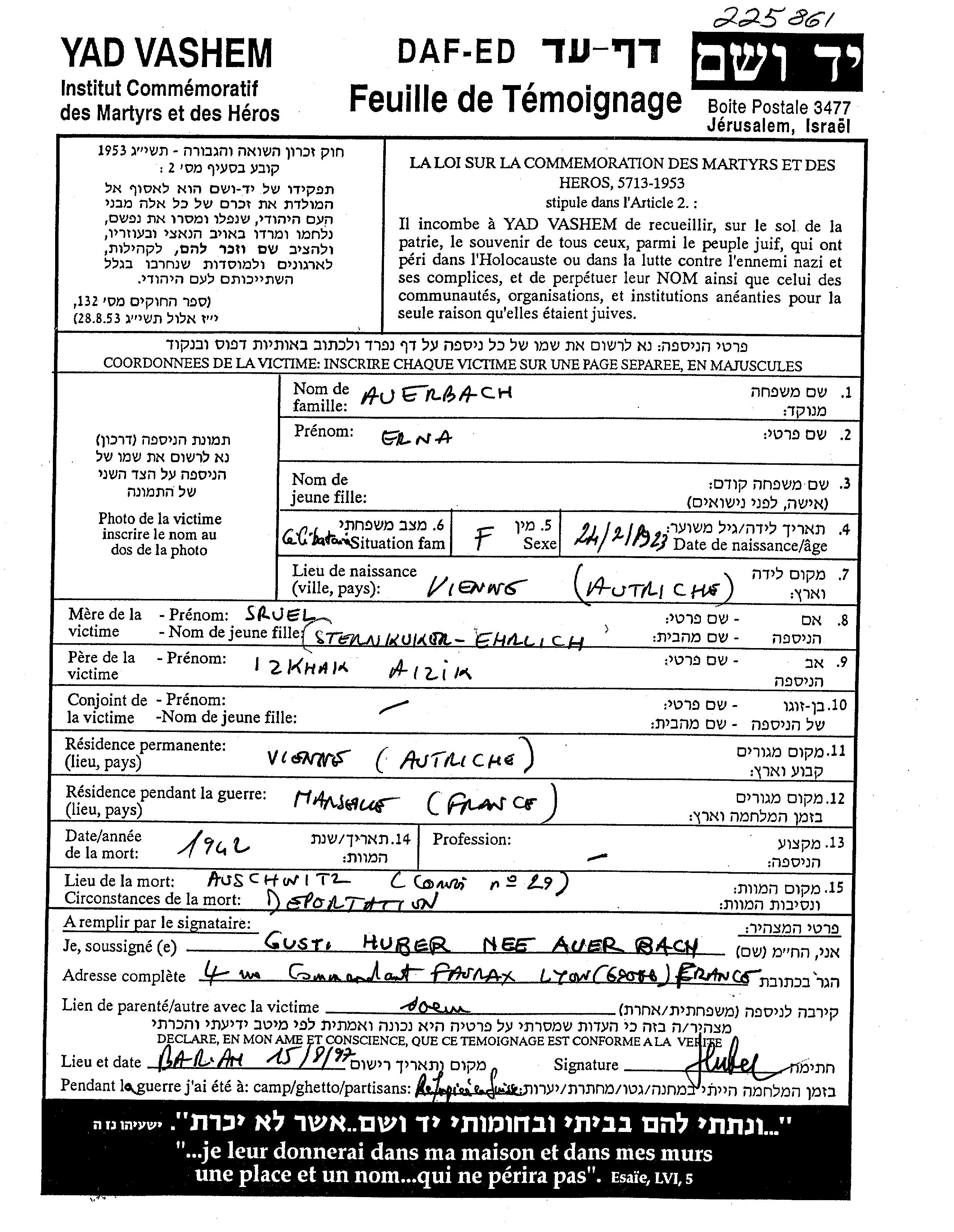 Erna ארנה Auerbach נולדה בWien שבאוסטריה בשנת 1923 לIzkhak וSruel שרה לבית Sternkuker Ehrlich. היא היתה רווקה. לפני מלחמת העולם השניה התגוררה בWien שבאוסטריה. בזמן המלחמה היא היתה בMarseille שבצרפת. היא נרצחה בשואה. מקום המוות: Auschwitz שבפולין בשנת 1942.
